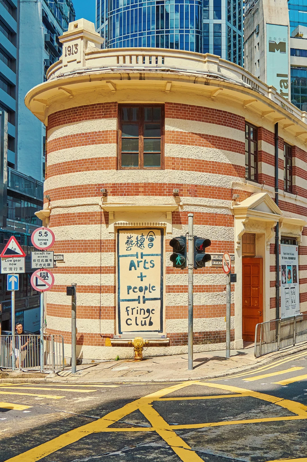 7.艺穗会:奶黄色建筑前的红绿灯斑马线,这里是一个十字路口,我超喜欢这里的港风街景