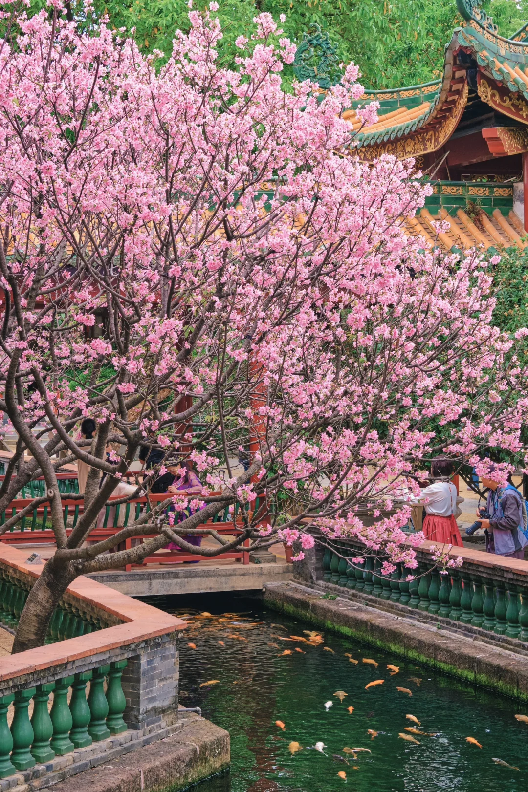 古檐飞角与繁花相映🌸满池锦鲤叼着花瓣跃动~