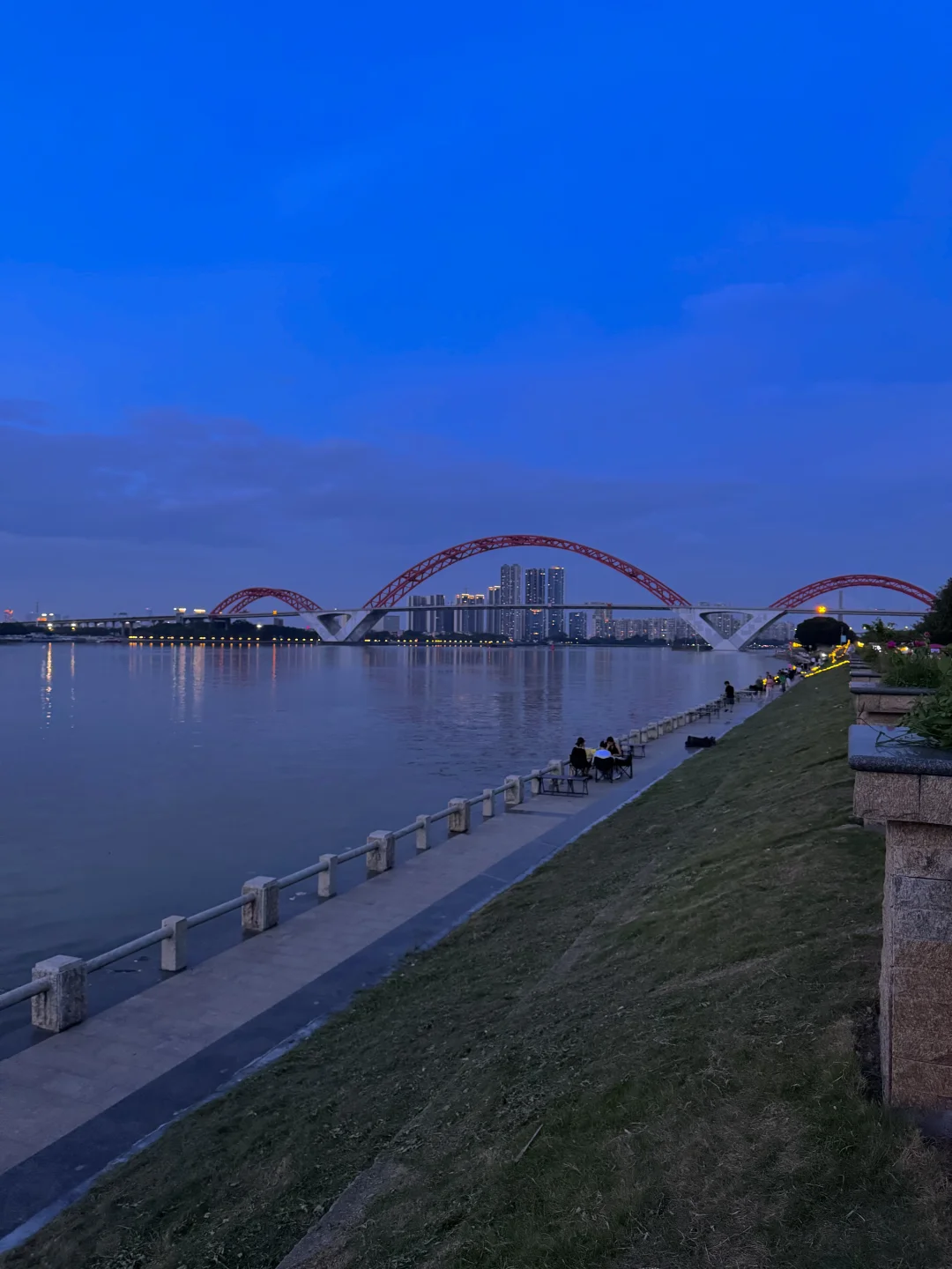不妨来这条江边走走。不用特意追夕阳,说不定你也会像我一样,在某个晚风轻拂的时刻,撞见猝不及防的那片蓝。