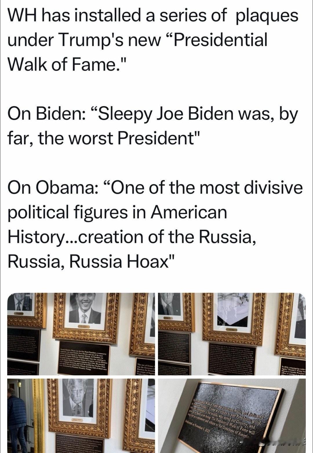 白宫已按照川普新设的“总统名人步道”竖立了一系列牌匾: 关于 Biden:“瞌睡Joe Biden 绝对是史上最糟糕的总统。” 关于 Obama:“美国历史上最具分裂性的政治人物之一……炮制了‘通俄门、通俄门、通俄门’的骗局。”
