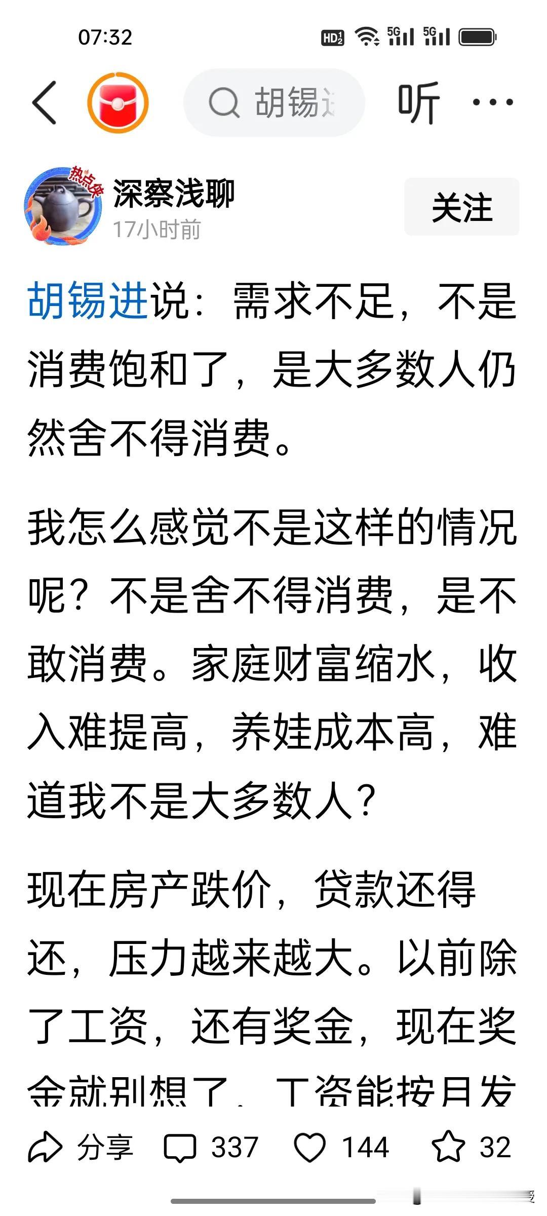 胡锡进还是很听劝的,观点已经前置了,昨天发了一篇关于提高城乡居民收入扩大消费的文章,可是还是有网友掐住老胡在文章结尾的一句话一顿猛批,老胡昨天很生气地贴出一个网友掐头去尾深加工他的文章,表示很生气,可是“野火烧不尽,春风吹又生”,想抓住老胡的言语疏漏处,博眼球的网友实在太多了。 老胡已经前置观点说了要让老百姓更有钱,收入增加才能扩大消费,这个观点没毛病,但是文章最后一句话,说了“中国人舍不得消费”,又遭一顿猛批。 老胡写文章还是得言简意赅,言多必失,字数控制在300字以内,观点必须明确,且前后一致,不然依旧会有很多网友会乐于批老胡为了博眼球。