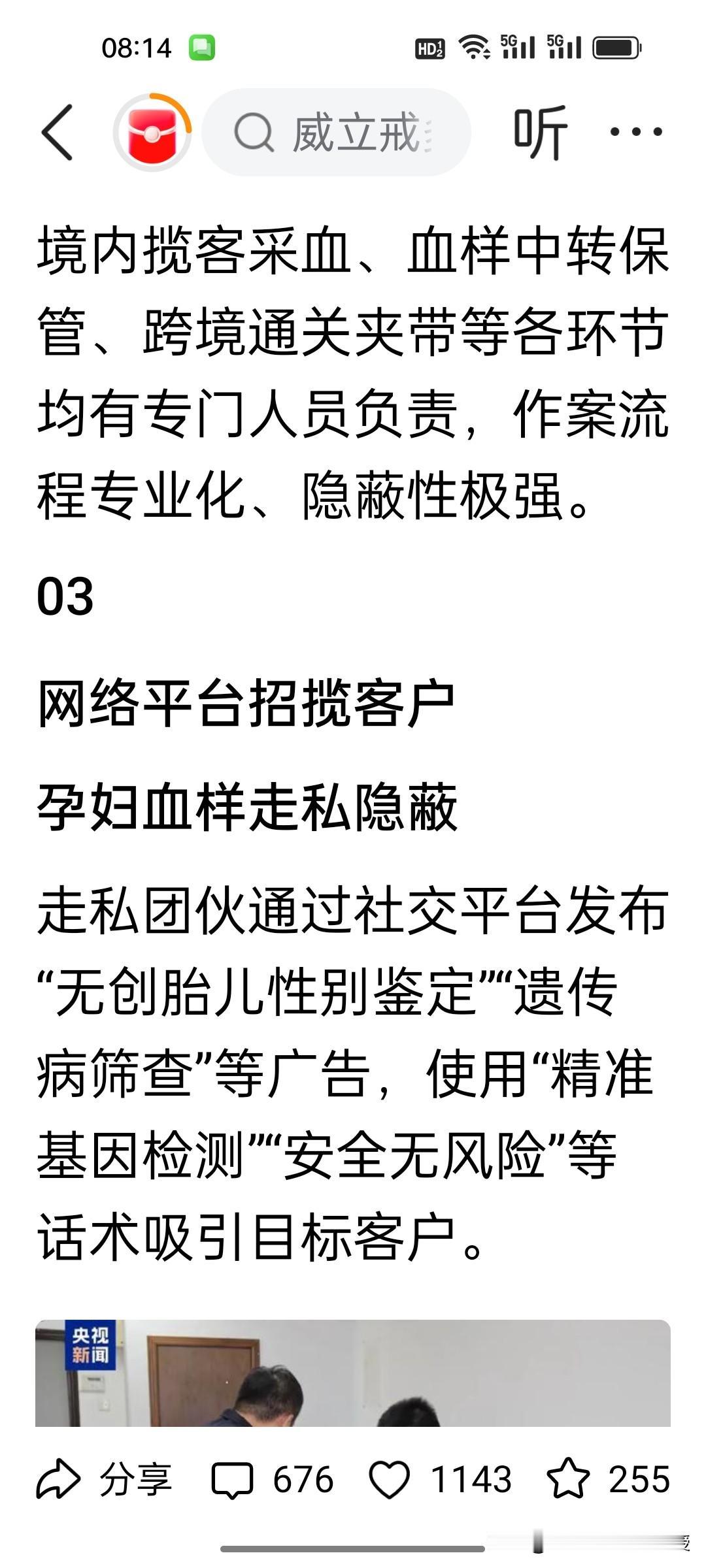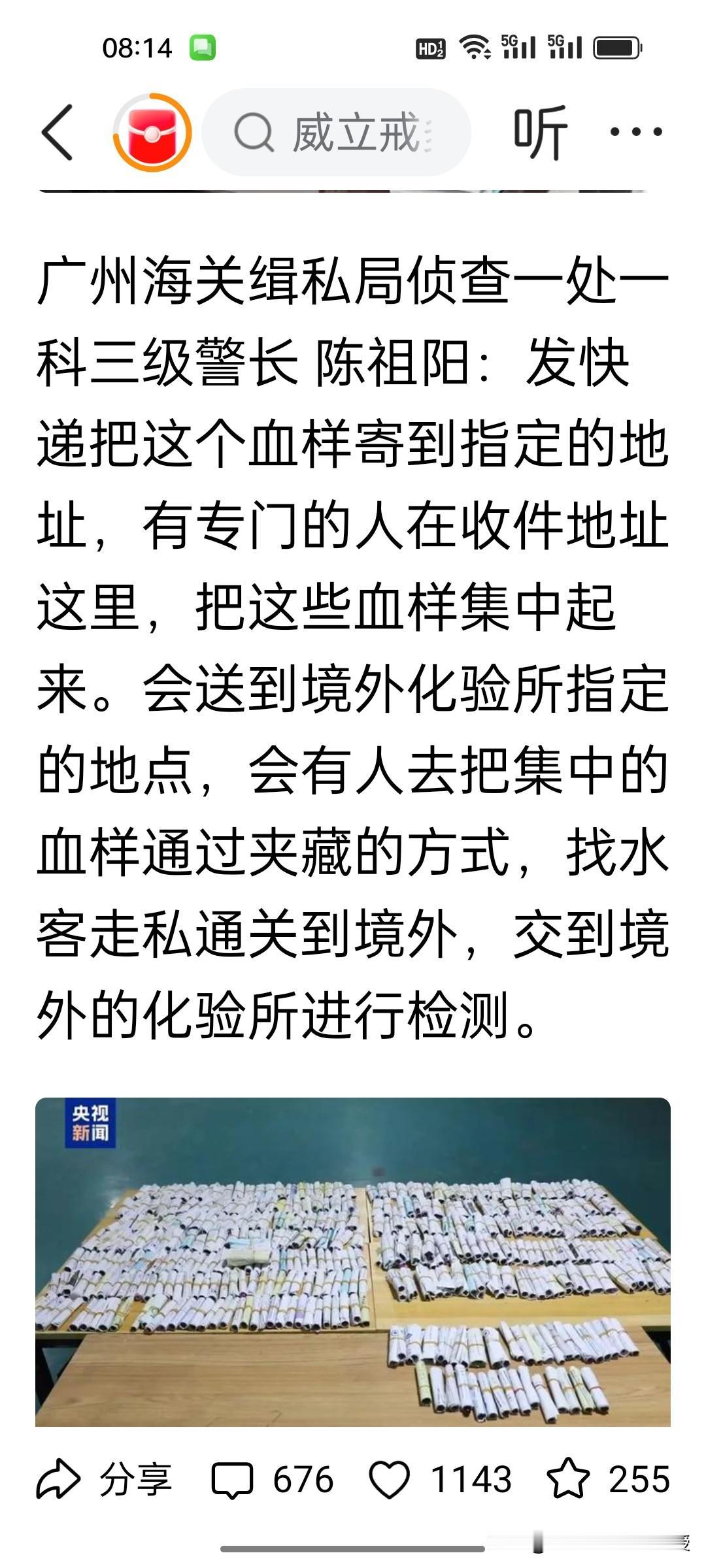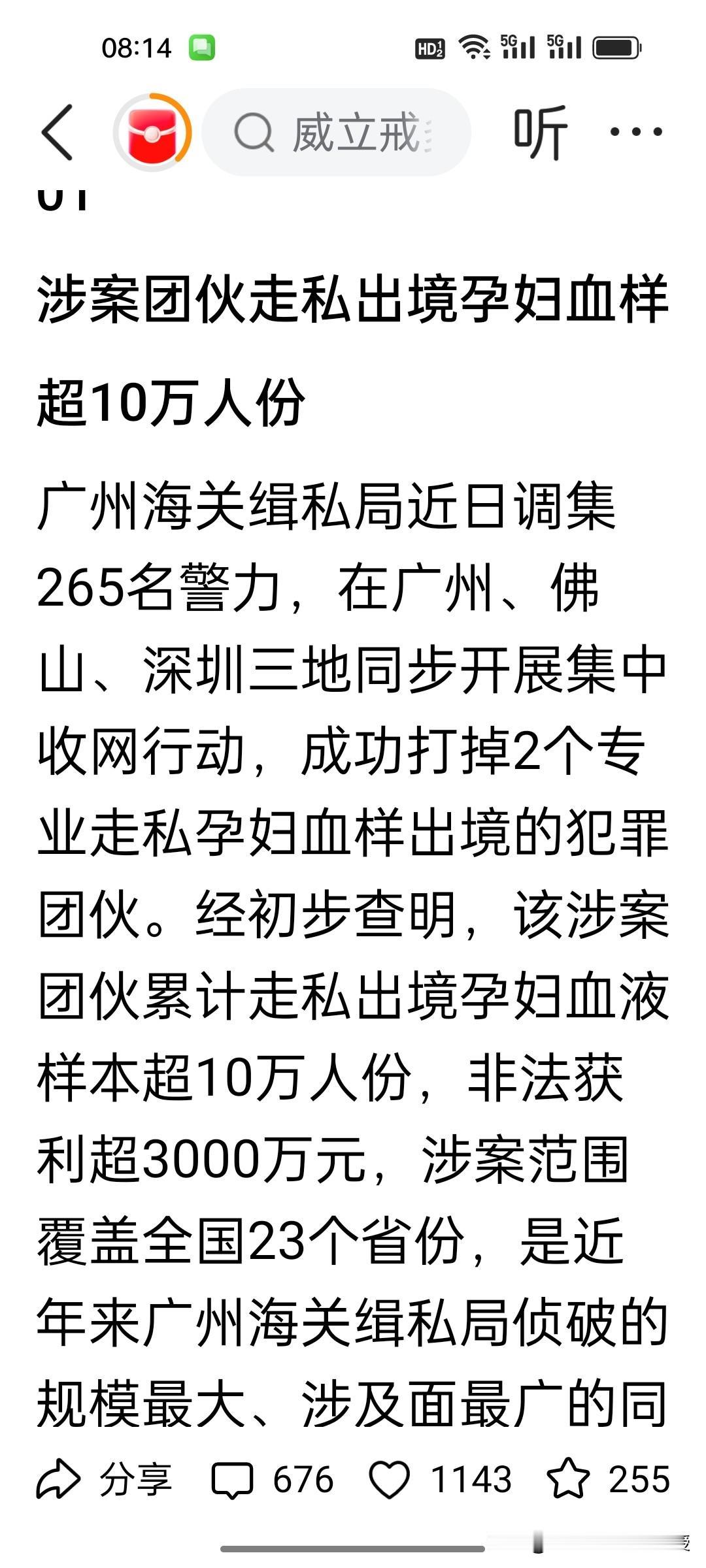 这条新闻太震惊!10万名孕妇血液样本被走私出境,涉案团伙26人非法获利3000万,孕妇花3000元就能知道胎儿性别?别再天真受骗。 根据《央视新闻》报道,近期,广州海关缉私局成功破获特大走私孕妇血样系列案,这竟然是一起涉及全国23个省份的跨境黑色产业链。这可涉及到我国人类遗传基因的大问题。需要弄清楚的是,这些血样走私到哪个国家?走私出去给哪个机构用?这条调查的明线不能丢,得顺藤摸瓜搞清楚,这10万份孕妇血样分明是在偷偷收割一个民族的基因根基,因此必须严查到底!