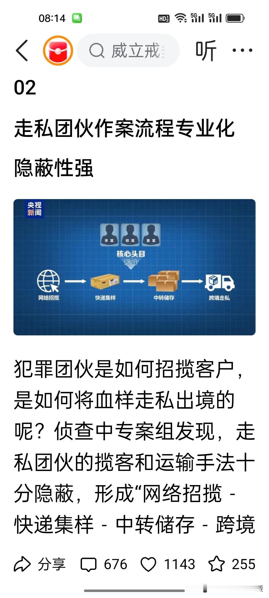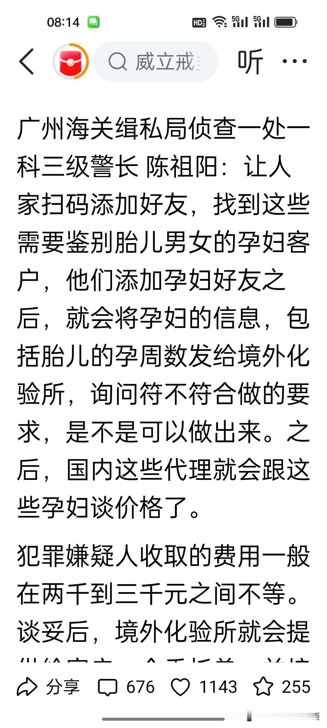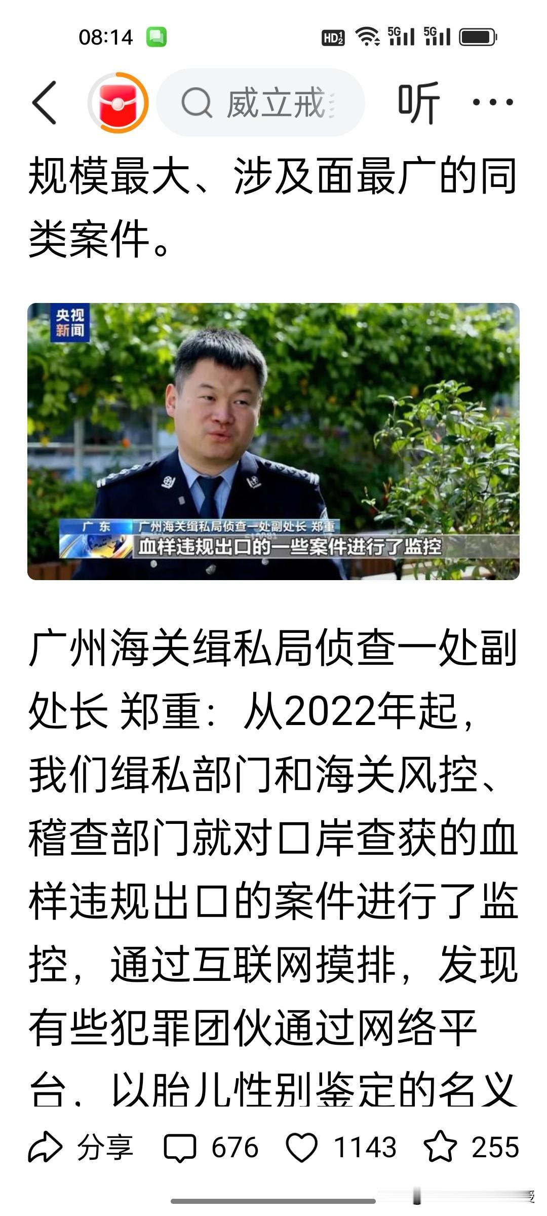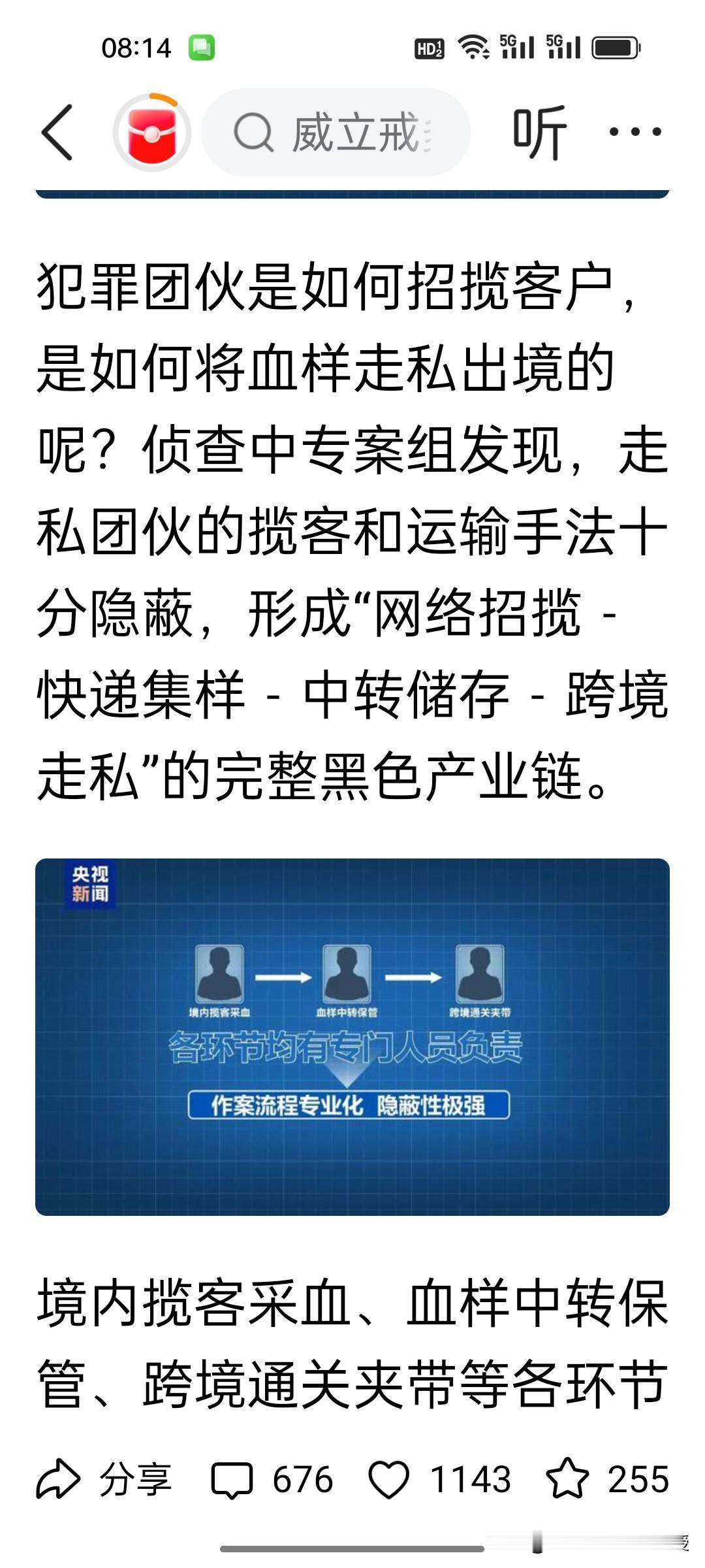这条新闻太震惊!10万名孕妇血液样本被走私出境,涉案团伙26人非法获利3000万,孕妇花3000元就能知道胎儿性别?别再天真受骗。 根据《央视新闻》报道,近期,广州海关缉私局成功破获特大走私孕妇血样系列案,这竟然是一起涉及全国23个省份的跨境黑色产业链。这可涉及到我国人类遗传基因的大问题。需要弄清楚的是,这些血样走私到哪个国家?走私出去给哪个机构用?这条调查的明线不能丢,得顺藤摸瓜搞清楚,这10万份孕妇血样分明是在偷偷收割一个民族的基因根基,因此必须严查到底!