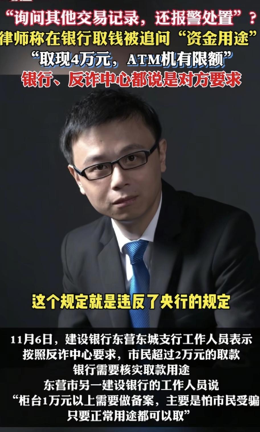去银行取自己的4万块,竟被当“犯人”审问?律师当场硬刚! 山东东营,律师周筱赟去建行取4万元。柜员突然要求他详细说明每一分钱的用途,还追问其他交易记录。律师怒了:这是违法! 周律师直接反驳:“央行规定取5万以上才需登记用途,我取4万,你凭啥查我?” 他认为银行在“反诈”名义下层层加码,严重侵犯储户隐私。银行解释:反诈需要。 建行事后想道歉,被周律师拒绝: “错的是制定规则的管理层,不是柜员。”目前金融监管局已介入调查。 网友炸锅:“今天问你用途,明天是不是要查流水?”“取自己的钱,像在交代赃款…”“支持律师较真,才能推动改变!” 取款自由 vs 反诈边界,你觉得银行这么做合理吗?取钱问用途
