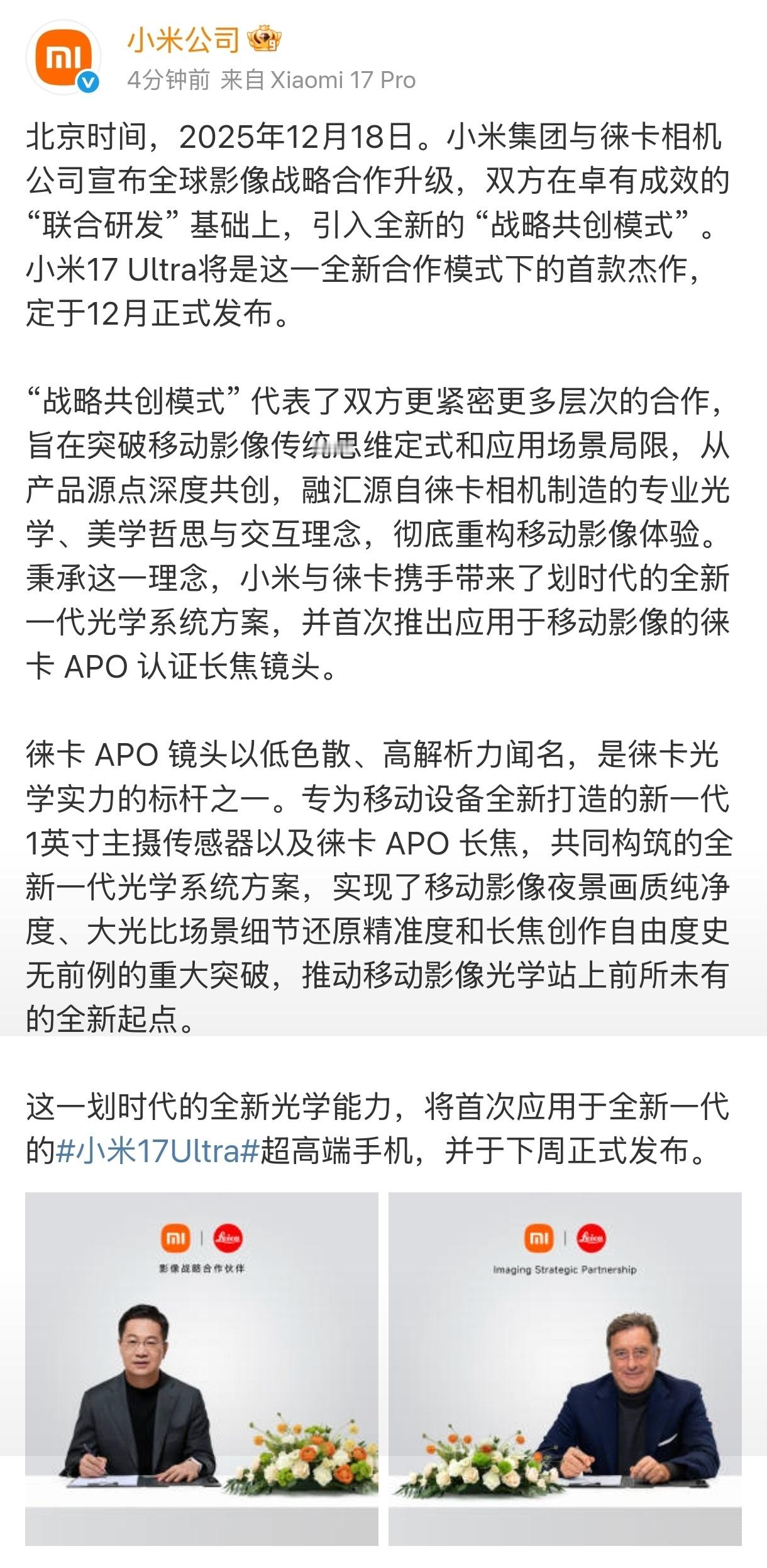 给大家划下米徕战略合作升级的重点,下周就要考试了重点1:战略合作升级,代表了双方更紧密更多层次的合作-标准答案:可能不止一款,小米要有自己的非凡大师了重点2:新一代1英寸主摄以及徕卡APO长焦,构筑全新一代光学系统方案-标准答案:1英寸+2亿长焦影像机皇,可能是26年唯一重点3:长焦创作自由度史无前例的重大突破-标准答案:长焦有代差级创新,也是26年唯一
