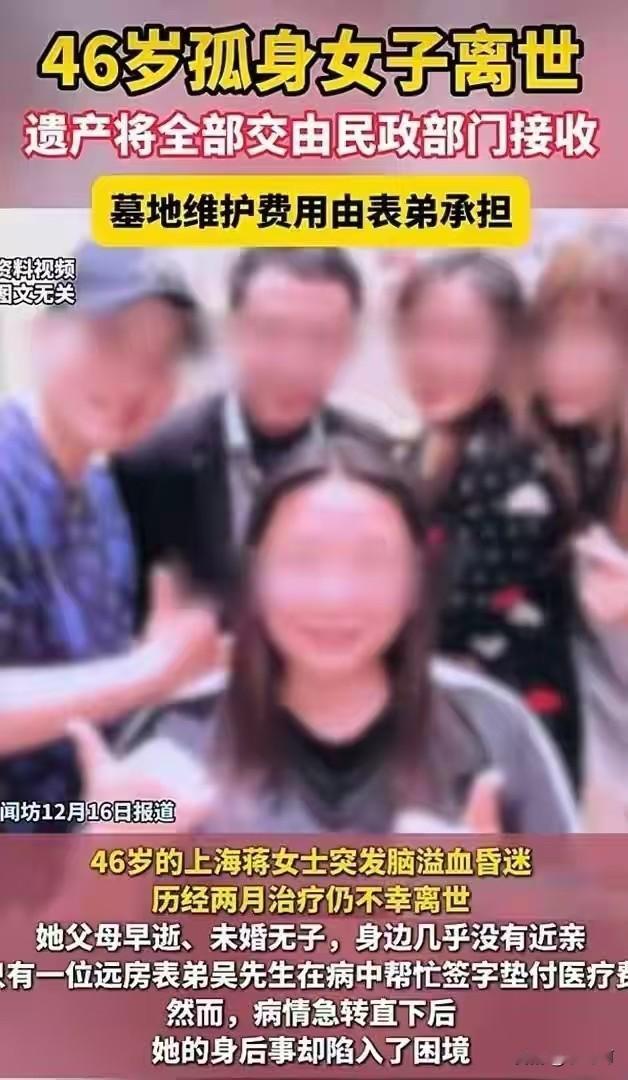 手术时无人签字,去世后无处安葬。 2025年12月14日,46岁的上海蒋女士因病医治无效去世。而她生病住院和去世以后发生的一切却让人感慨万千。 46岁的将女士父母双亡、一生没有结婚,也没有经常联系的近亲属。但年轻的她早已经给自己做好了规划:年轻时努力工作,给自己配置各种保险,年老了去养老院安度晚年。 然后现实却狠狠地把她的梦想打得粉碎!今年10月份,将女士突发昏迷住进了医院! 住进医院的将女士孤身一人,又处于昏迷状态,手术时必须要有人签字,但翻遍了她手机通讯录也找不到一个能有资格签字的人。 住进医院的将女士还面临一个问题:无法缴纳医疗费。虽然她的账户上有钱,保险公司也有保险费,但处于昏迷中的将女士无法办理! 医院和社区联系后,最终帮她找到了她一位远房表弟吴先生。吴先生跑前跑后帮忙,前前后后一共垫付了几万元手术费,这场手术终于做了。 手术后,将女士已经在慢慢地恢复好转。然后12月初,将女士病情突然恶化,没有抢救回来去世了。 表弟吴先生想表姐年纪轻轻地就遭遇不幸去世了,打算和朋友们一起用将女士的抚恤金替将女士购买一处墓地。等吴先生去办理购买事宜时,得到的答复竟然是:将女士生前没有遗嘱,她名下的全部资产将交由民政部门全部接收,她的安葬方式为海葬! 如果吴先生坚持帮表姐购买墓地,需要在允许的范围之内才可以,而以后的维护费用则需要吴先生承担! 明天和意外真的不知道哪个先来,年纪轻轻的将女士更不可能会想到,她的手术会无人签名,她的后事竟是如此结果。 取材网络,侵删