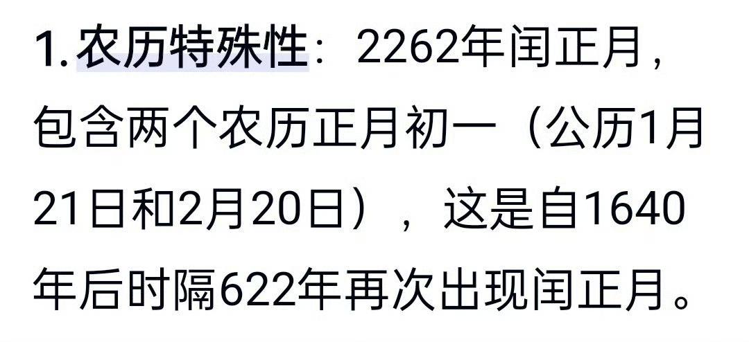 2262年2个春节只放1次假!!! 2262年有两个春节这事儿在网上爆火,大家都玩起了梗,什么连着吃两顿年夜饭、放两次长假的想法层出不穷。不过,现实很骨感。民俗专家说了,只有正经的正月初一才是官方认证的春节,就算有闰正月初一,节日氛围也复制不了。就像2009年闰五月,端午节也只过一次。 而且现在放假制度这么精打细算,哪可能因为同一个理由放两次假。上一次闰正月是1640年,下一次要等到2357年。咱也活不到2262年,就当乐呵乐呵,还是继续老老实实搬砖吧。 无春节是什么 春节起源 二o二五年夜饭 春节假期天数 春节差异 来源:大河报