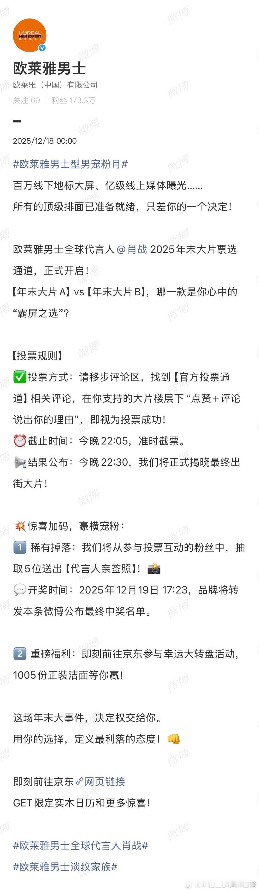 欧莱雅男士全球代言人肖战 十二月最难抉择的事情出现了,发起地广投放图投票活动!这次的地广图直接让粉丝决定,还准备了亲签和1005份正装洁面抽奖送给粉丝~真的看到了品牌对代言人的重视程度!这波宠粉福利简直不要太让人羡慕啊啊啊!没有不参与不支持的义务!