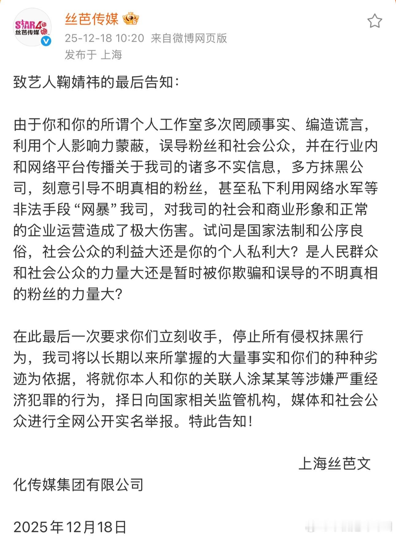 丝芭喊话鞠婧祎再不收手将实名举报放狠话还用微博你们丝芭都没有微信是吧