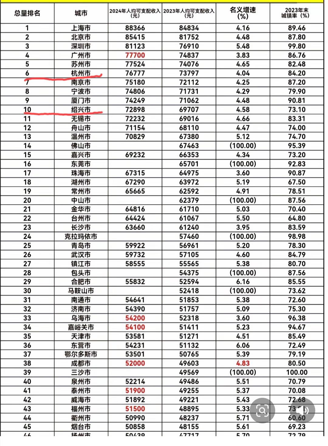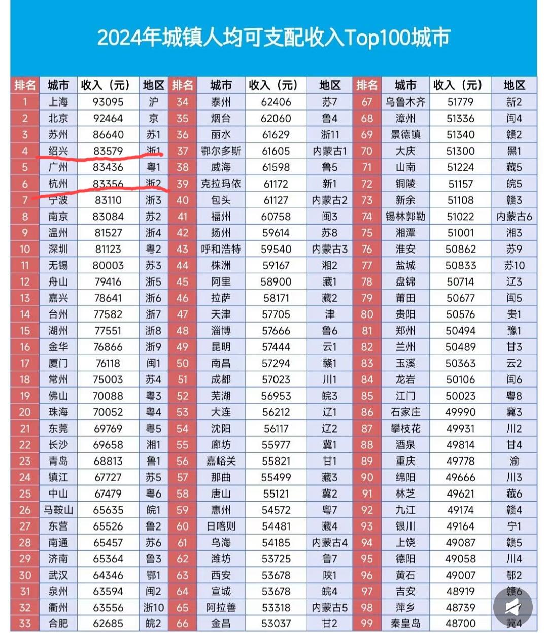 绍兴2024年城镇人均可支配收入排名浙江第一,农村人均可支配收入排名浙江第三。人均可支配收入排名全国第10。再对比省城杭州,杭州2024年城镇人均可支配收入排名浙江第2,农村人均可支配收入排名浙江第5。人均可支配收入排名全国第6。 大家有没有发现一个奇怪的现象:绍兴的城里人比杭州的有钱,绍兴的农村人也比杭州的有钱,可最后绍兴人还是没杭州人有钱!!! 我咋这么想不通呢?
