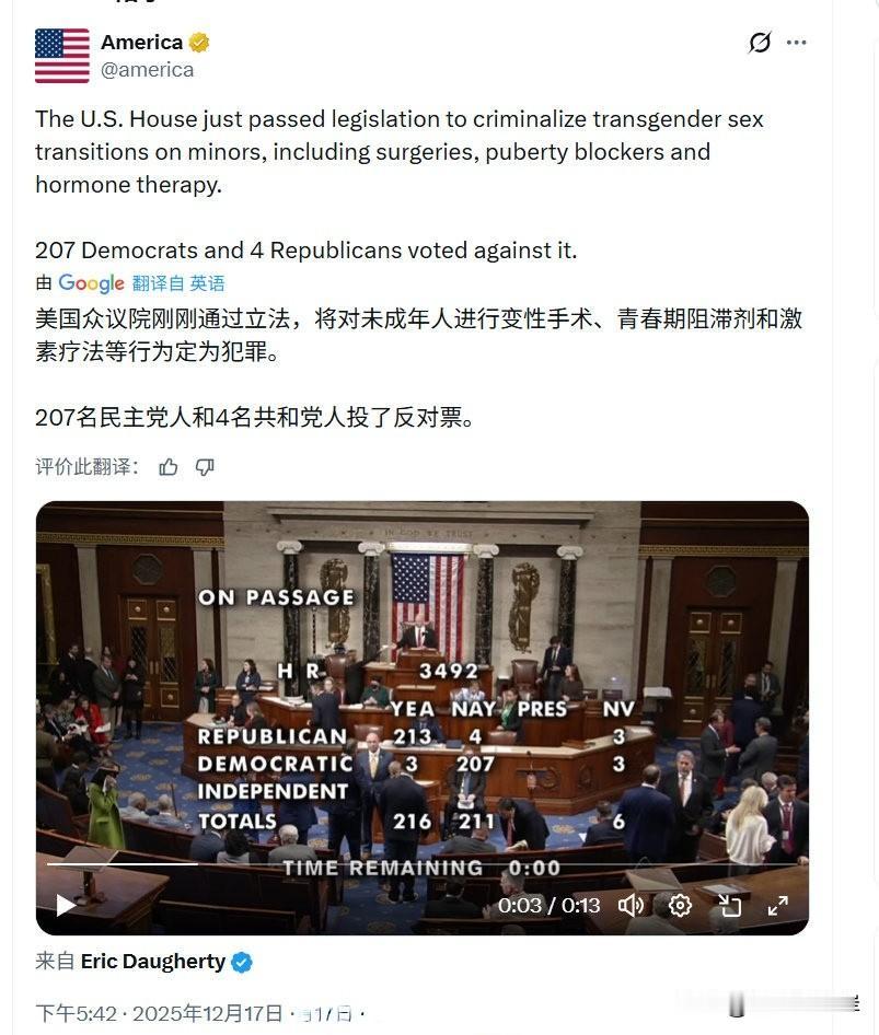 美国众议院刚刚通过立法,将针对未成年人的跨性别手术、青春期阻滞剂和激素疗法定为刑事犯罪。 207 名民主党人和 4 名共和党人投了反对票。