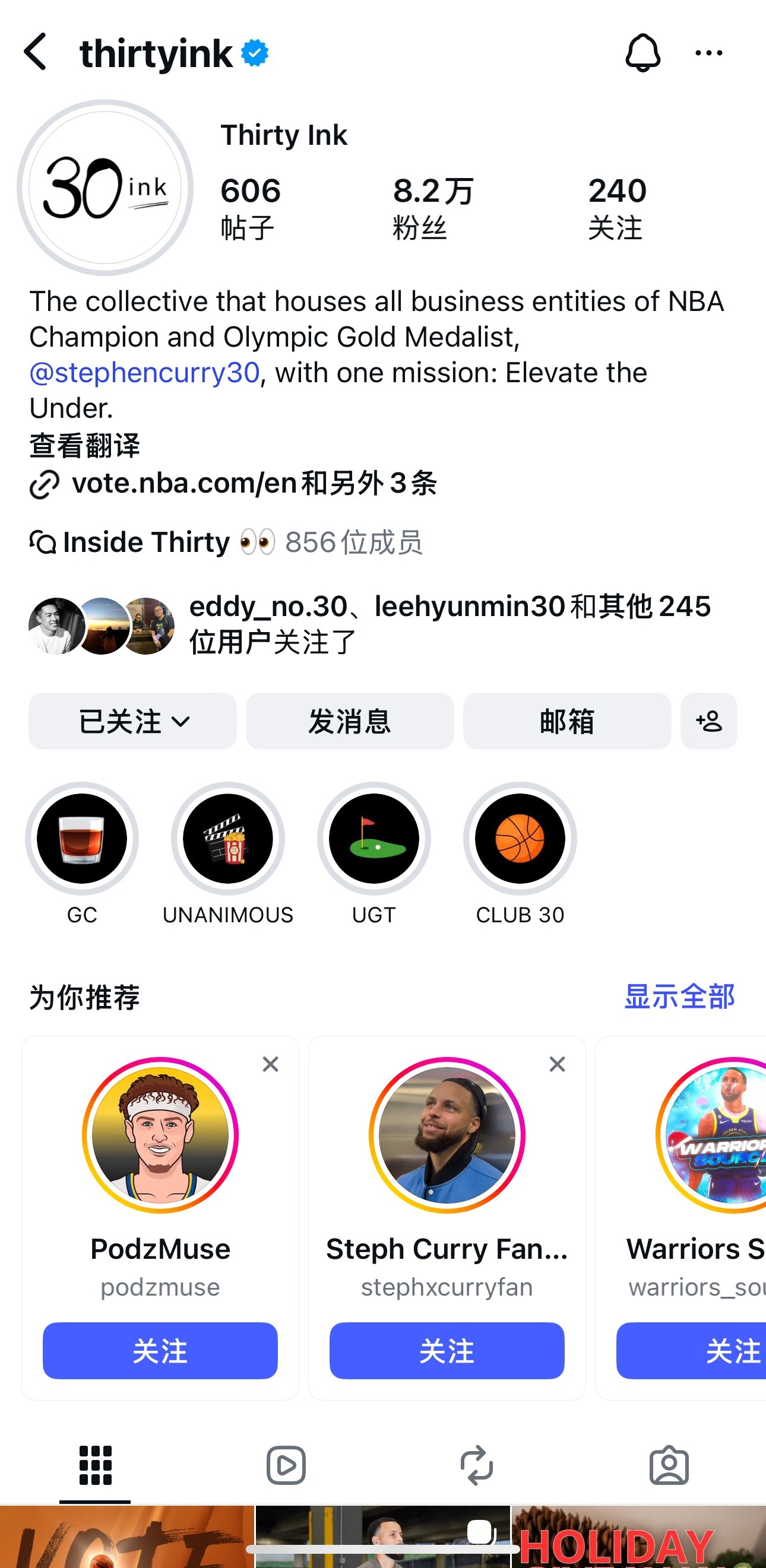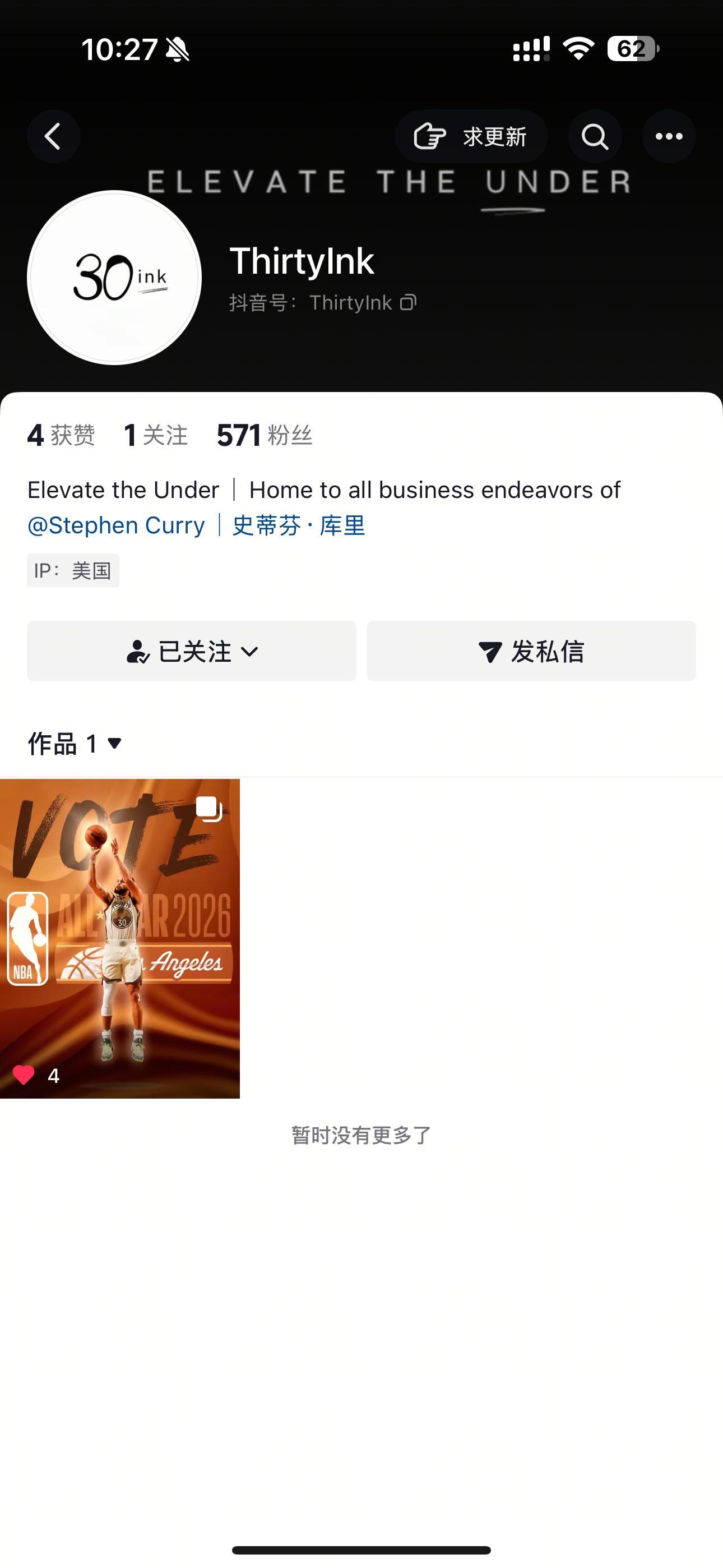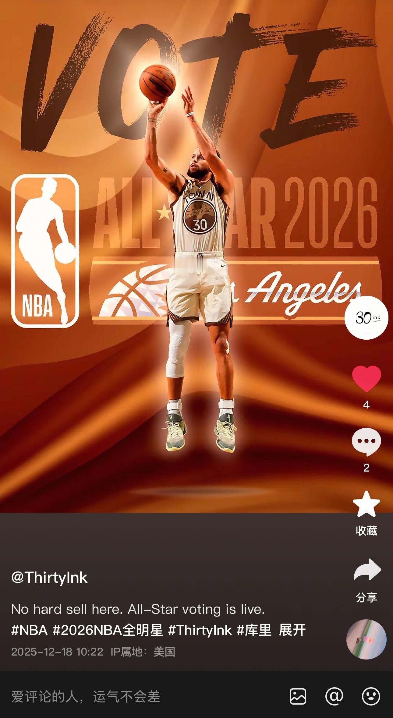 库里的公司团队ThirtyInk入驻抖音啦目前看到库里已经关注这个账号了,应该就是确定的了,而且也在为库里明年的全明星开始拉票了CurrySoleNews库里2026NBA全明星投票