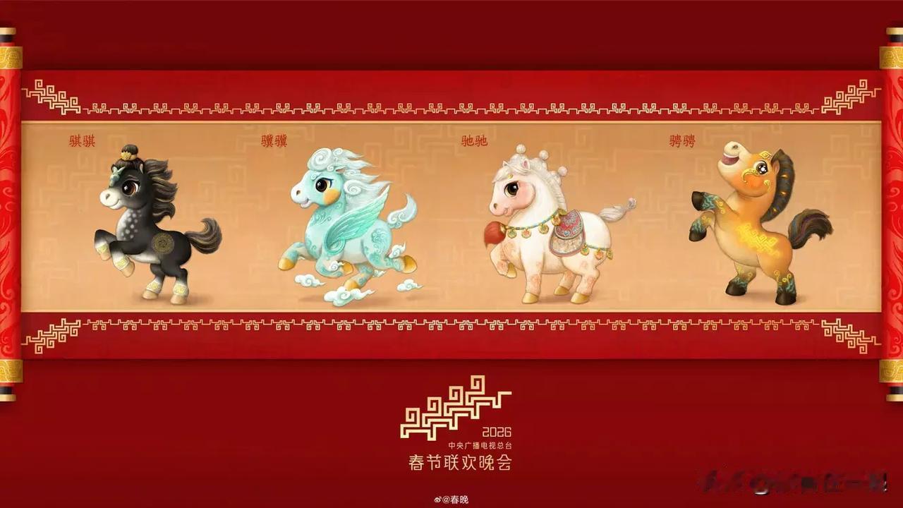 马年春晚有新动静啦! 12月18日,《2026年春节联欢晚会》吉祥物“骐骐”“骥骥”“驰驰”“骋骋”四匹骏马亮相。它们活泼可爱、意气风发,和晚会主题“骐骥驰骋 势不可挡”超搭。 这些吉祥物设计灵感源于中国不同时期马的经典形象,还融入流云纹、山云纹等千年纹样,历史感和时代感满满,寓意马到成功、前程似锦。像“骐骐”灵感来自西周盠驹尊,配色青黑,气质典雅;“骥骥”参考汉代天马和铜奔马,双翼舒展;“驰驰”源自唐代三花马,意气风发;“骋骋”原型是普氏野马。 感觉这届春晚有看头! 马年春晚