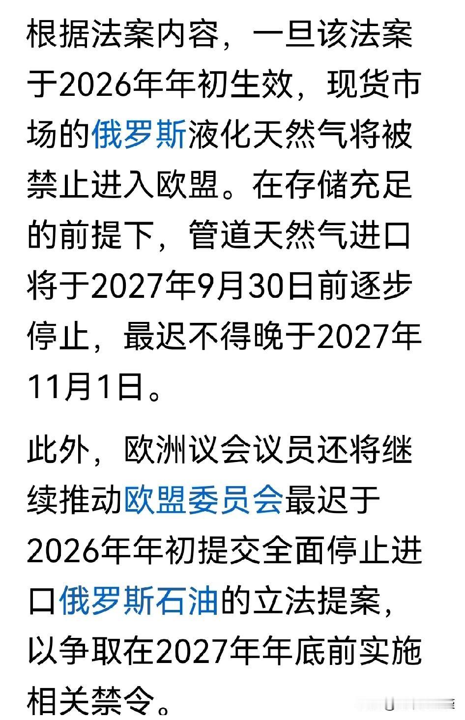 还是欧盟会玩,既当又立的精髓他们学的很到位。不服不行啊! 欧洲议会对于停止对俄罗斯天然气的进口,他们投票了,500赞成,120票反对,然后就通过了。 说来也怪,喊了好几年了,一直没啥实际行动。但现在终于硬气了,通过法案把这事敲定了,这是欧洲硬气的一面。高低得喝几瓶82年吧他们! 但他们另一面是这样的,他们又给自己了一个缓冲,就是到2027年9月30日前逐步停止,这还没完,又说了句最晚11月1日前[笑哭]。你说说,经常对别人双标的他们,这次也给自己用上了! 硬又不敢太硬。怂又怂的不够彻底,这帮抱团的,抱成这样也难为他们了!看来他们今年冬天取暖没啥问题[灵光一闪] 欧洲 欧洲 欧盟 欧盟委员会 欧盟法令 欧盟争议言论 欧洲欧盟 欧盟能源新政 欧盟天然气禁令