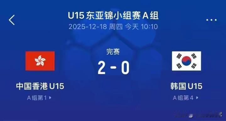 中国香港U15男足真是让人惊叹不已!在今天结束的一场U15东亚杯A组小组赛中,中国香港队以2:0完胜韩国队,暂居小组第一。坦白说,中国香港队能够击败韩国队肯定让很多人感到意外,这似乎预示着韩国足球正在走向没落? 值得一提的是,中国队将会在下午迎战日本队,我相信中国香港队的获胜一定能够极大的增强中国队小伙子们的自信心,我预感中国队会小胜日本队。