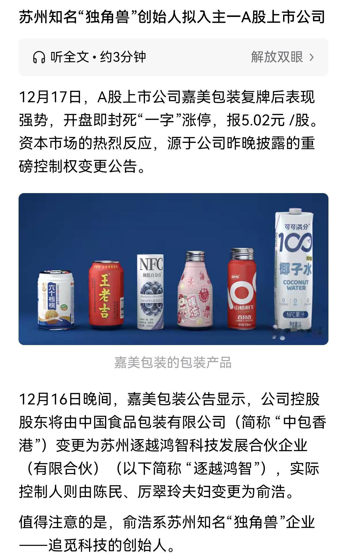 追觅科技创始人余浩入主嘉美包装,让人忍不住猜测是不是要借壳上市。12月16日晚,嘉美包装公告原控股股东“中包香港”拟4.45元/股转让29.90%股份给逐越鸿智,交易约12.43亿,逐越鸿智实控人正是余浩。此次采用“协议转让+表决权放弃+部分要约收购”方案,完成后逐越鸿智预计持股54.90%。嘉美包装主营金属易拉罐等,和追觅业务差异大。此前三六零借壳江南嘉捷上市在前,要是余浩把追觅装入嘉美包装,那追觅就能借壳上市。
