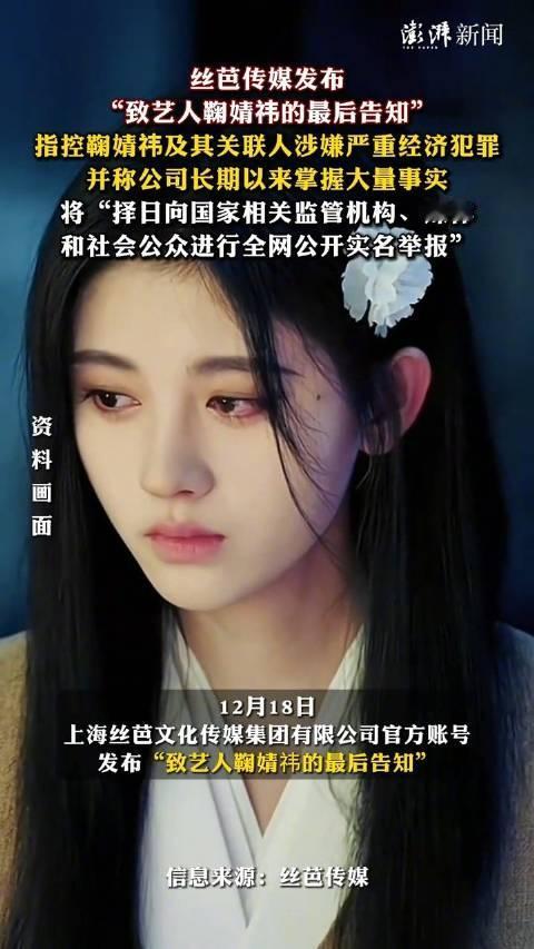 丝芭将就鞠婧祎涉嫌经济犯罪行为向相关部门举报,鞠婧祎与丝芭合约大战升级,撕开娱乐圈合约乱象 一边是“涉嫌经济犯罪”的重磅指控,一边是“协议系伪造”的强硬回击,鞠婧祎与丝芭传媒的合约纠纷彻底陷入“罗生门”,成为年末娱乐圈最受关注的大戏。两份结论相悖的笔迹鉴定报告,将这场持续已久的博弈推向高潮,也让娱乐圈藏在聚光灯后的合约乱象彻底暴露在公众视野中。 矛盾的焦点始终围绕一份补充协议。丝芭传媒强势发难,晒出笔迹鉴定报告力证协议真实有效,直言鞠婧祎需履行合约至2033年,甚至抛出“经济犯罪”的指控,态度强硬;反观鞠婧祎方,不仅拿出另一份“无法判断签名为本人所写”的鉴定报告作为反击,更直接揭露丝芭存在“双重合同”,涉嫌侵占艺人收入,将双方的利益纠葛摆上台面。 如今事件已正式进入司法程序,但舆论场上的讨论早已炸开锅。“天价合约”“霸王条款”“经纪公司权益边界”等话题接连登上热搜,网友纷纷质疑艺人合约的透明度。不少人感慨,顶流艺人尚且陷入如此纠纷,那些底层艺人的处境恐怕更难言说。 事实上,这场纠纷的胜负早已超出个人范畴。无论最终司法结果如何,都已撕开了娱乐行业合同规范缺失的遮羞布。长期以来,艺人与经纪公司之间的不对等关系、合约条款的模糊地带、监管机制的漏洞,都让类似纠纷屡见不鲜。公众期待的不仅是这场官司的公正判决,更希望借此推动行业监管的加强,让艺人的合法权益得到真正保障,让娱乐圈的规则回归透明与公正。