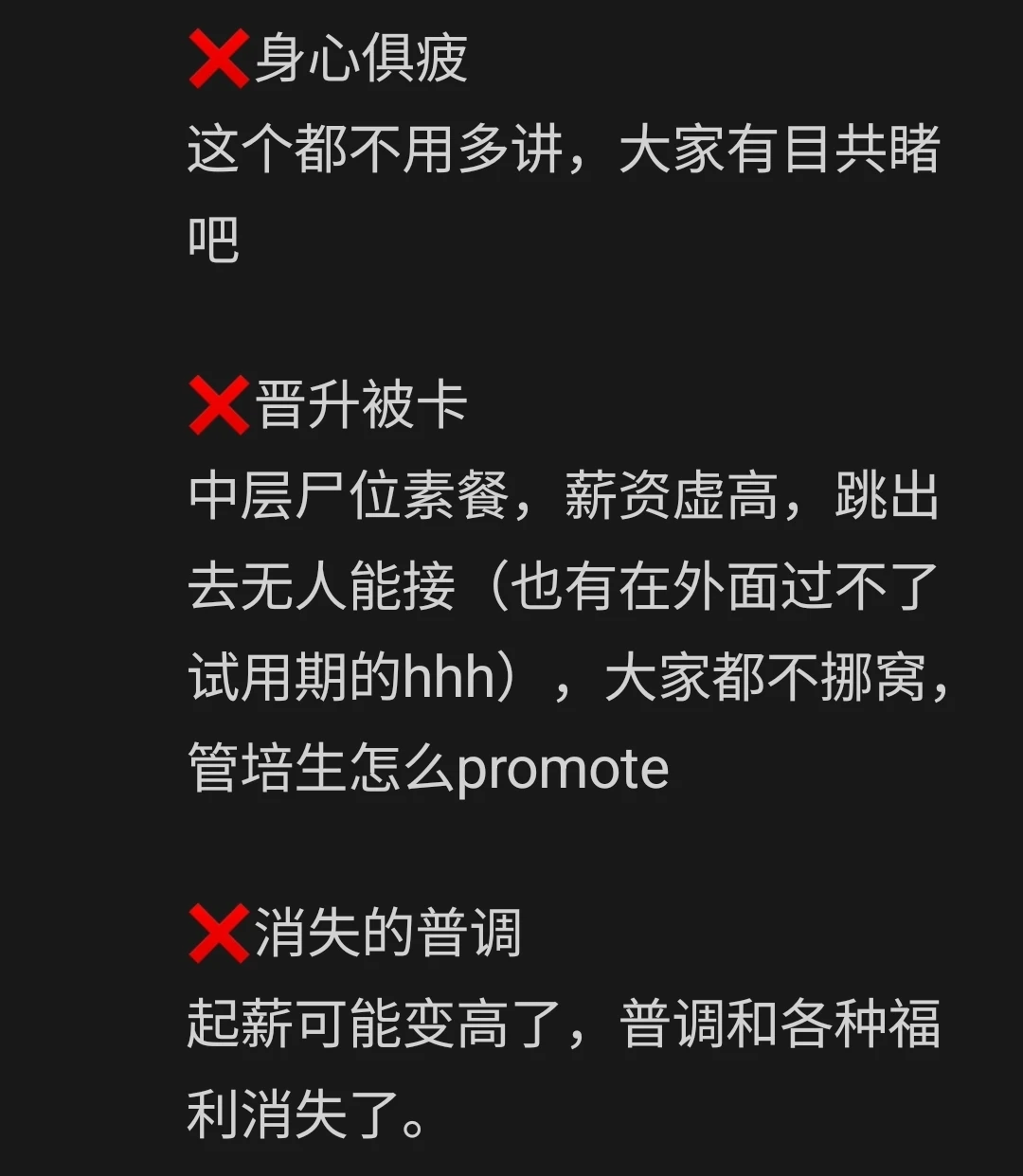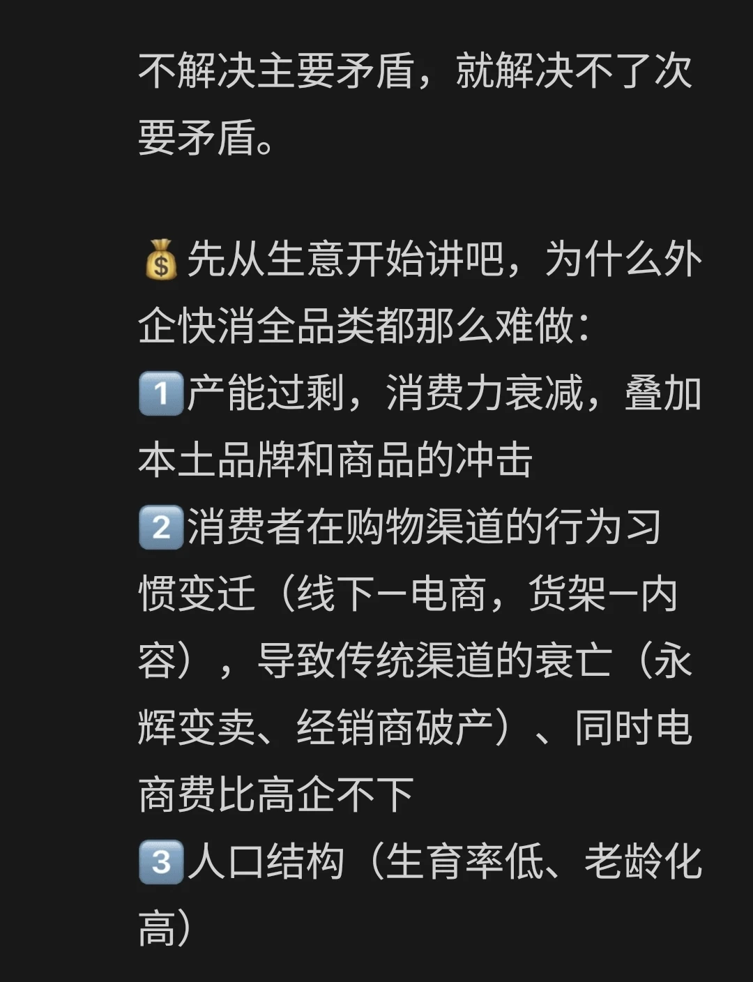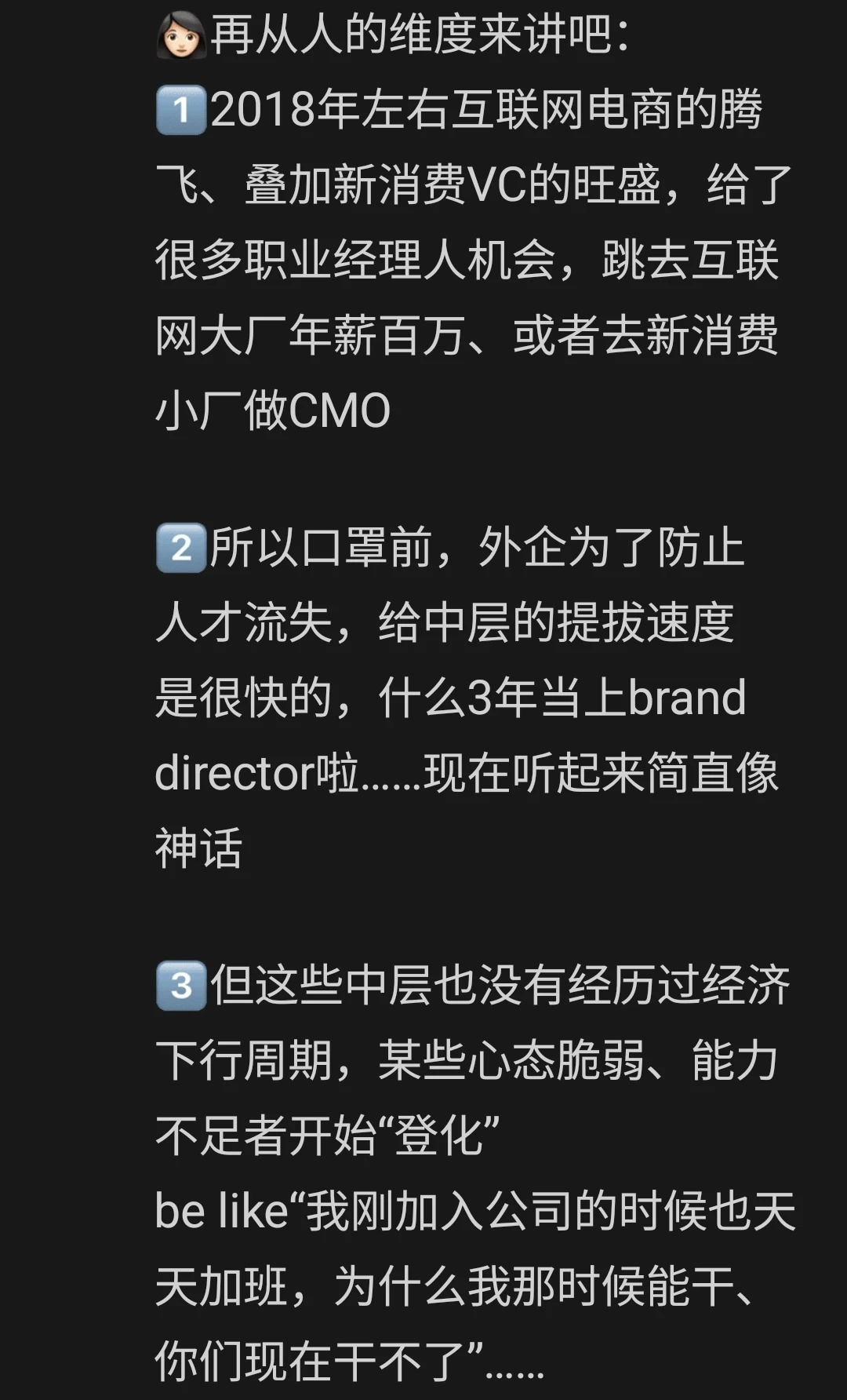外企快消目前存在的主要矛盾,是【日渐下行的生意(经济基础)】、和【僵化组织架构(上层建筑)】的矛盾。 而次要矛盾,是【尸位素餐的中层领导】,和【自我性极强的管培生】之间的阶级矛盾。 不解决主要矛盾,就解决不了次要矛盾 我衷心希望,有能力的人、能够改变世界的人,更多地加入企业。忍一忍,熬一熬,青春的年纪摆在这里,世界最终会是你们的天下。 希望有朝一日,天朗气清,惠风和畅。
