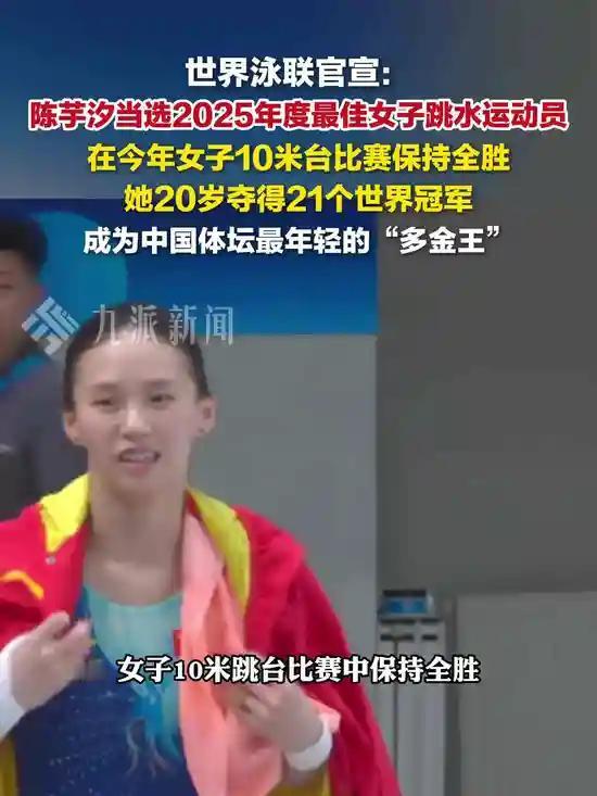 陈芋汐:跳水界闪耀新星,首夺年度最佳 北京时间12月17日,2025年国际跳水赛季完美收官,世界泳联年度最佳跳水运动员名单揭晓,中国跳水名将陈芋汐与澳大利亚选手卡西尔·鲁索分别斩获女子、男子最佳殊荣。值得一提的是,2024年该奖项花落全红婵和曹缘,中国跳水选手持续展现强大统治力。 2025赛季,陈芋汐状态神勇,堪称跳水赛场的“常胜将军”。跳水世界杯系列赛中,她七战全胜;5月初北京超级总决赛,一举拿下女子单人10米台、双人10米台及混合团体三项冠军。新加坡世界游泳锦标赛上,她再度包揽这三项冠军,成为首位世锦赛女子单人10米台“四冠王”,世锦赛金牌总数达9枚。 首次荣膺世界泳联年度最佳女子跳水运动员,陈芋汐实至名归,也助力中国队延续对该荣誉的垄断,她正以卓越表现,在女子10米台项目树立全球新标杆!