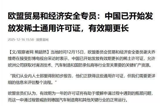 明年反华就没有后顾之忧了,欧盟贸易和经济安全专员确认:中国已开始发放发稀土通用许可证,有效期更长。 当地时间12月15日,欧盟委员会贸易和经济安全委员谢夫乔维奇在接受彭博电视台采访时表示,中国已开始发放有效期更长的稀土许可证,允许欧洲公司获取对清洁技术、汽车制造和国防承包商等行业至关重要的关键矿产资源。 看这谢夫乔维奇在镜头前志在必得的样子,仿佛一夜之间悬在欧洲脑门上的利剑就入鞘了。这话传回来,网上炸锅了,大伙儿憋屈啊,这不就是被人打了左脸,还乐呵呵给人递热茶吗? 大家心想,咱们手里握着稀土这张王牌,对面都快骑脖子上拉屎了,怎么还硬气不过三秒就开闸?尤其是那些心里打着小算盘的“国防承包商”,要是拿着咱们的稀土造出子弹再回头打咱们,这买卖做得岂不是太窝囊? 但这事儿,咱还真别急着上火。细看这所谓的“放行”,根本不是认怂,而是一招高明的“请君入瓮”,谢夫乔维奇光顾着乐,怕是忘了10月9日商务部那是刚下了两道“紧箍咒”的。这一松一紧,门道深着呢。 最狠的一手,是藏在细节里的“0.1%溯源机制”。这玩意儿比装了定位器还准,只要产品里含了哪怕一丁点儿中国原产稀土,整条供应链咱都能查个底儿掉。 不管是转手给德国造车,还是法国搞风电,只要中方想看,随时透明,至于那些想偷偷摸摸挪去造军火的,或者想倒手给北约、日本的,趁早死了这条心。规则写得死死的,一旦发现用途跑偏,供应立马掐断。这哪是送礼,分明是给他们戴上了镣铐。 欧盟这次为啥乖乖低头认这规矩?没别的,真被逼急了。之前欧洲工厂缺稀土缺得嗷嗷叫,再不解决,电动车生产线得停,风电项目得瘫。 为了活命,哪还顾得上什么“去风险”的面子,老老实实按咱们定的流程,一口气交了2000份申请,这就是产业链实力的碾压,不服不行。 而且,咱们这盘棋下得那是相当有节奏。就在欧盟刚以为拿到糖吃的时候,12月17日,咱们反手就给欧盟猪肉贴上了五年的反倾销税。 这招“组合拳”打得漂亮:你要稀土救命,我给,显我大国格局,但你在贸易上搞事,我就揍你软肋,守我市场底线。比起欧盟那种一边拿资源一边使绊子的两面派,咱们这叫明明白白的阳谋。 有人问干嘛不直接封锁算了?别忘了,堵不如疏。看看国安部刚抓的那个把稀土伪装成陶瓷釉料走私的案子就知道,全面封锁只会把交易逼进地下黑市,那是给咱自己找麻烦,现在这样,把交易拉到阳光下监管,才是真正捏住了对方的七寸。 至于欧盟幻想的“反华无后顾之忧”,纯属做梦,挖土谁都会,但把土变成高纯原料的技术,九成以上都在咱手里,这就是护城河,也是达摩克利斯之剑。 这次合作,本质上是把欧洲的工业命脉,更紧地绑在了咱们的规则战车上。将来他们再想龇牙咧嘴,先得掂量掂量,会不会被这根看不见的绳索,瞬间勒住喉咙。