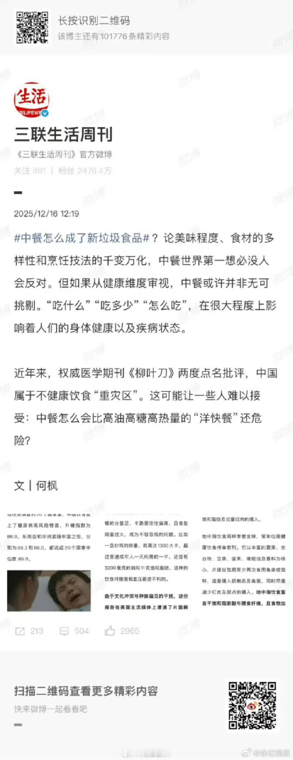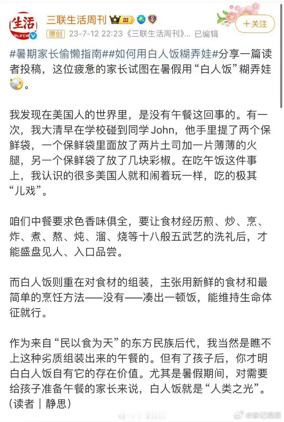 三联生活周刊的编辑领导们是不是拒绝所有中餐全体吃白人饭。白人饭是人类之光啊。虽然崇洋媚外不违法,但是起码也要把智商带上把。