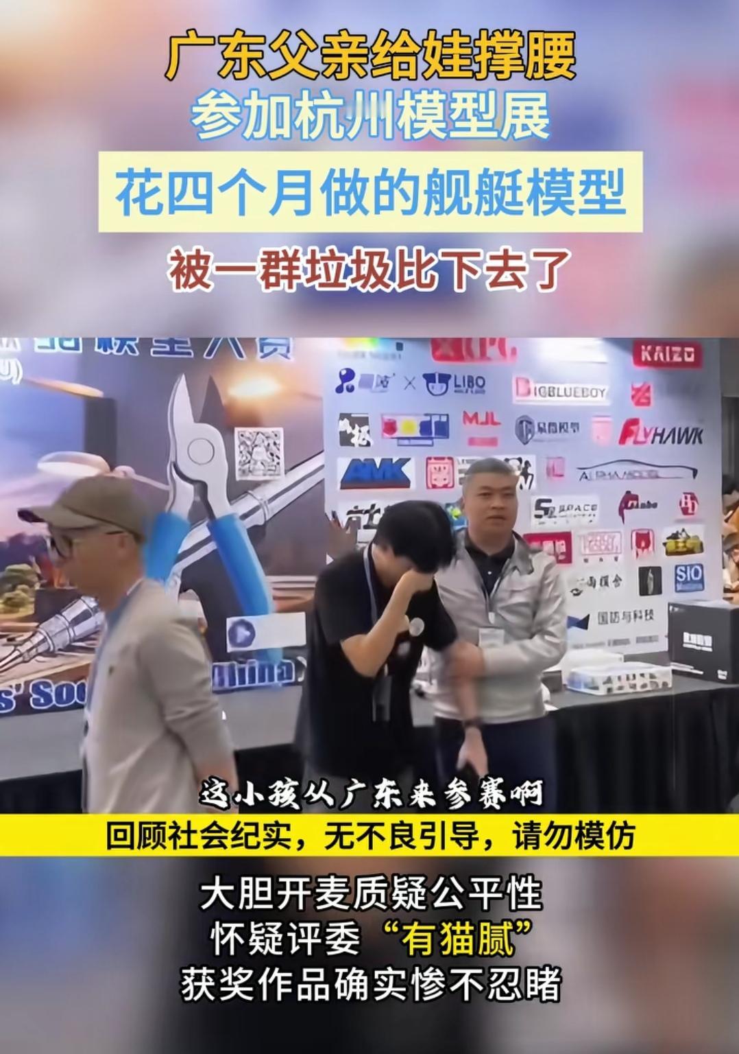 父亲为伤心的孩子鸣冤不平。 (如图所示)有个爱舰船模型的广东孩子来杭州参加比赛,花费四个月心血的作品被一堆垃圾比下去,孩子很伤心,父亲支持孩子,质疑比赛的公正性。不要太在意这样的黑箱操作,保持初心,坚定自己的梦想,比获奖更重要。