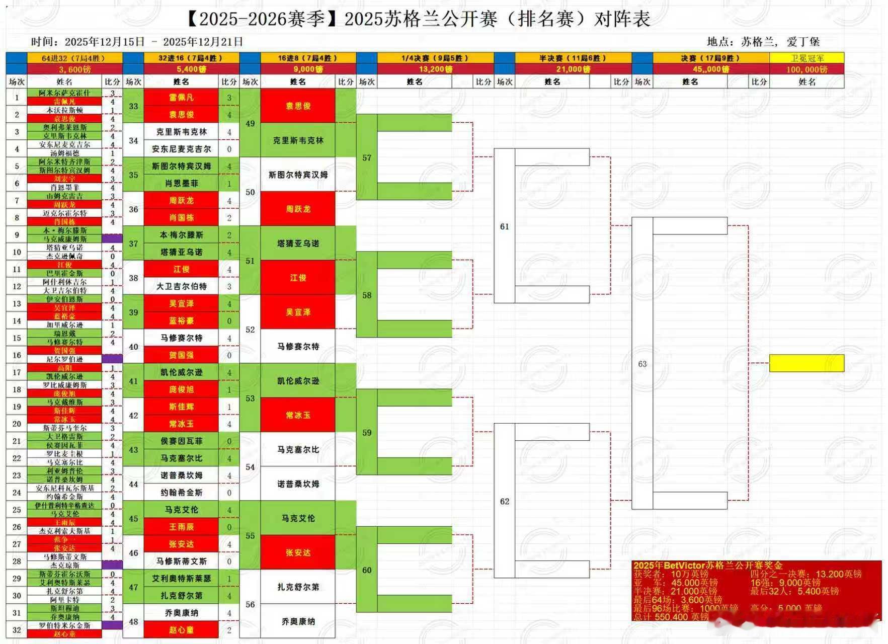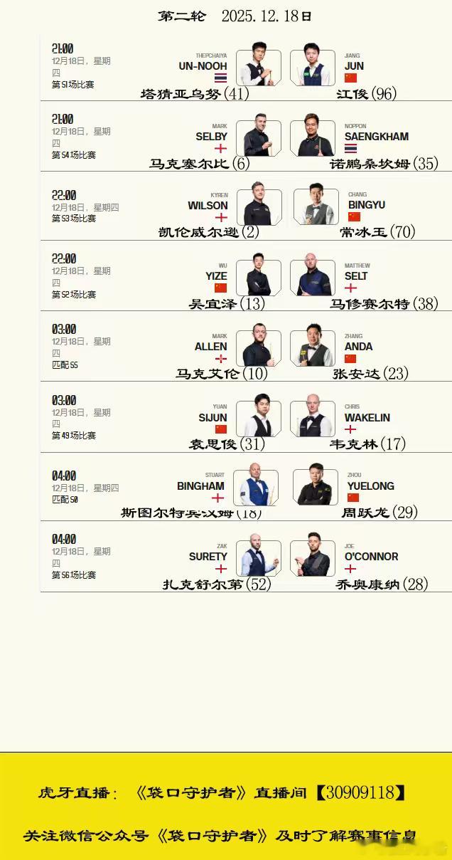 2025苏格兰公开赛第四天中国选手袁思俊、周跃龙、江俊、吴宜泽、常冰玉、张安达等6人晋级16强;2025.12.18日 星期四21:00 直播:江俊VS塔猜亚乌努接台不早于22:00:吴宜泽VS马修赛尔特2025.12.19日 星期五3:00直播:袁思俊VS韦克林不早于4:00直播:周跃龙VS斯特图宾汉姆