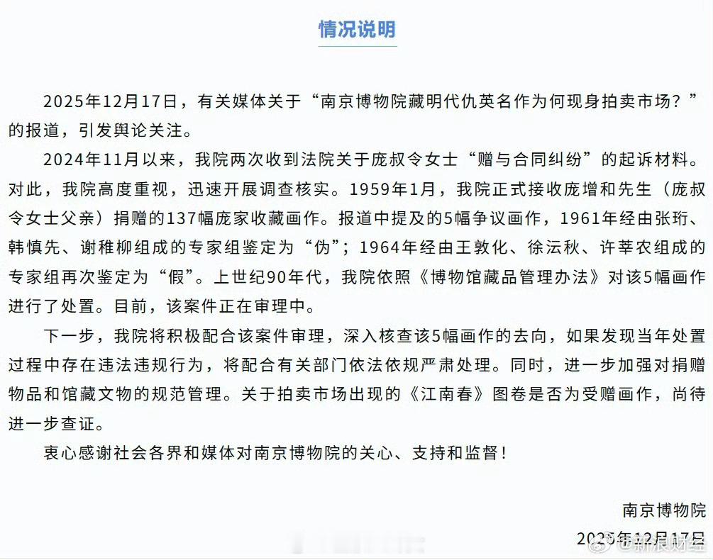 江苏文旅厅回应南博藏品现身拍卖南京博物院馆藏名画现身拍卖市场,江苏文旅厅回应:“内部正在研究,会有正式对外的口径”,若存在相关违法违规行为,将根据调查结果依法依规处置