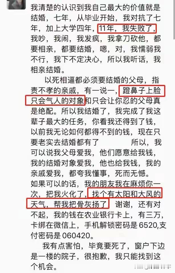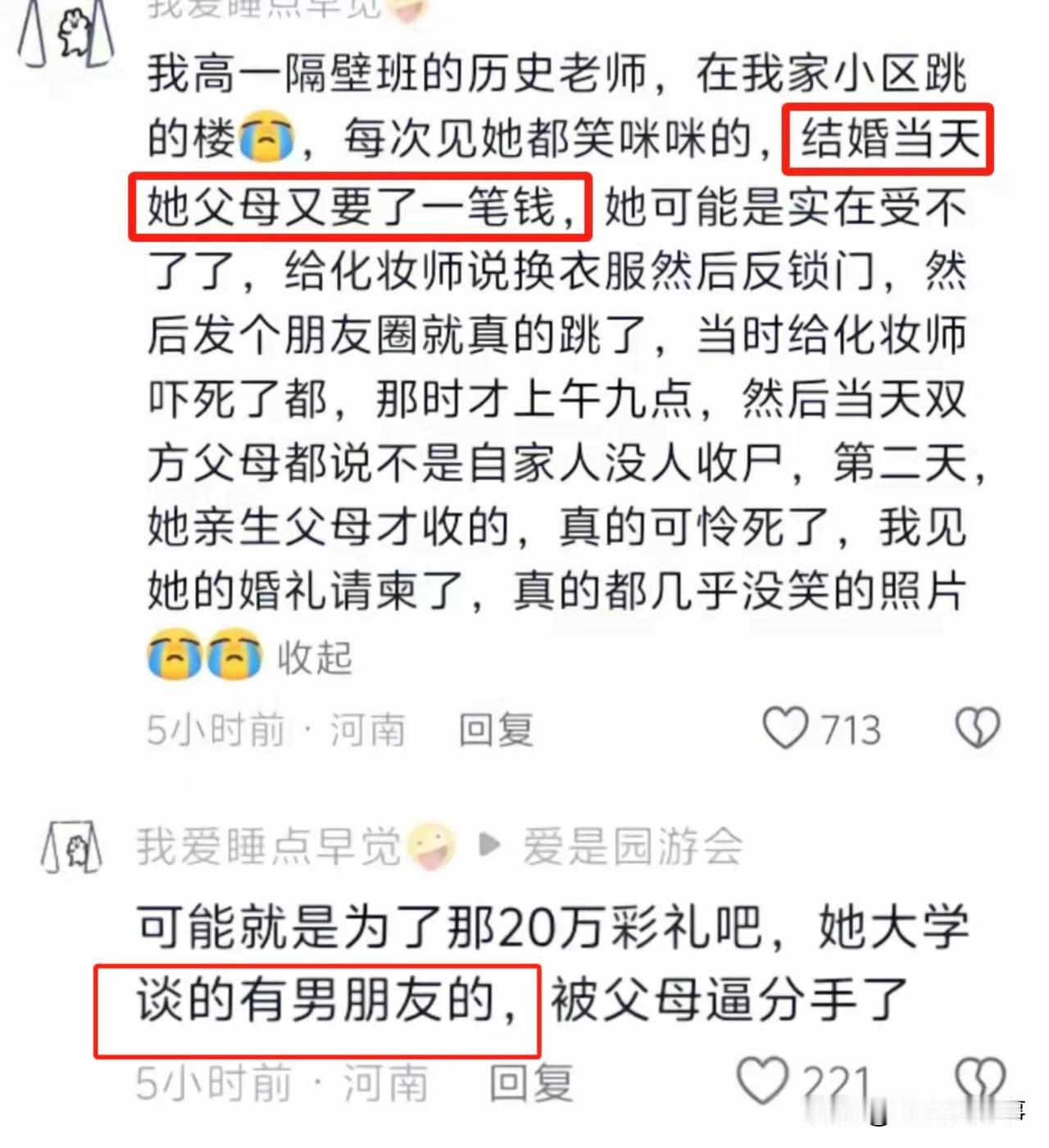 鲁山女教师一事,要是网友提供的线索没错,那就能解释得通她为什么会选择这一条路了。 也能理解她在朋友圈中提到男方对她蹬鼻子上脸,父母却让她忍了,说到底还是娘家人压倒她最后一根稻草。 她有一个哥哥和弟弟,哥哥已经结婚了,但弟弟还没有,生活在一个重男轻女的家庭里,她是没有选择权的。 很多人都不理解她发的朋友圈中提到,大学4年和毕业后的7年,难道17岁就开始催婚了。 也不奇怪,很多农村家庭对女孩子的出路选择,自出生以来就是找个好人家嫁了。 她想靠自己,想读书出人头地,但父母却认为读再多的书不如嫁个好人家。 因此,她在大学4年就被催婚的可能性也是有的。 本来嫁给一个不喜欢的人也不算什么问题,大不了就离了还能好好过日子。 但娘家人一直的压迫才是她承受不了的主要原因吧!