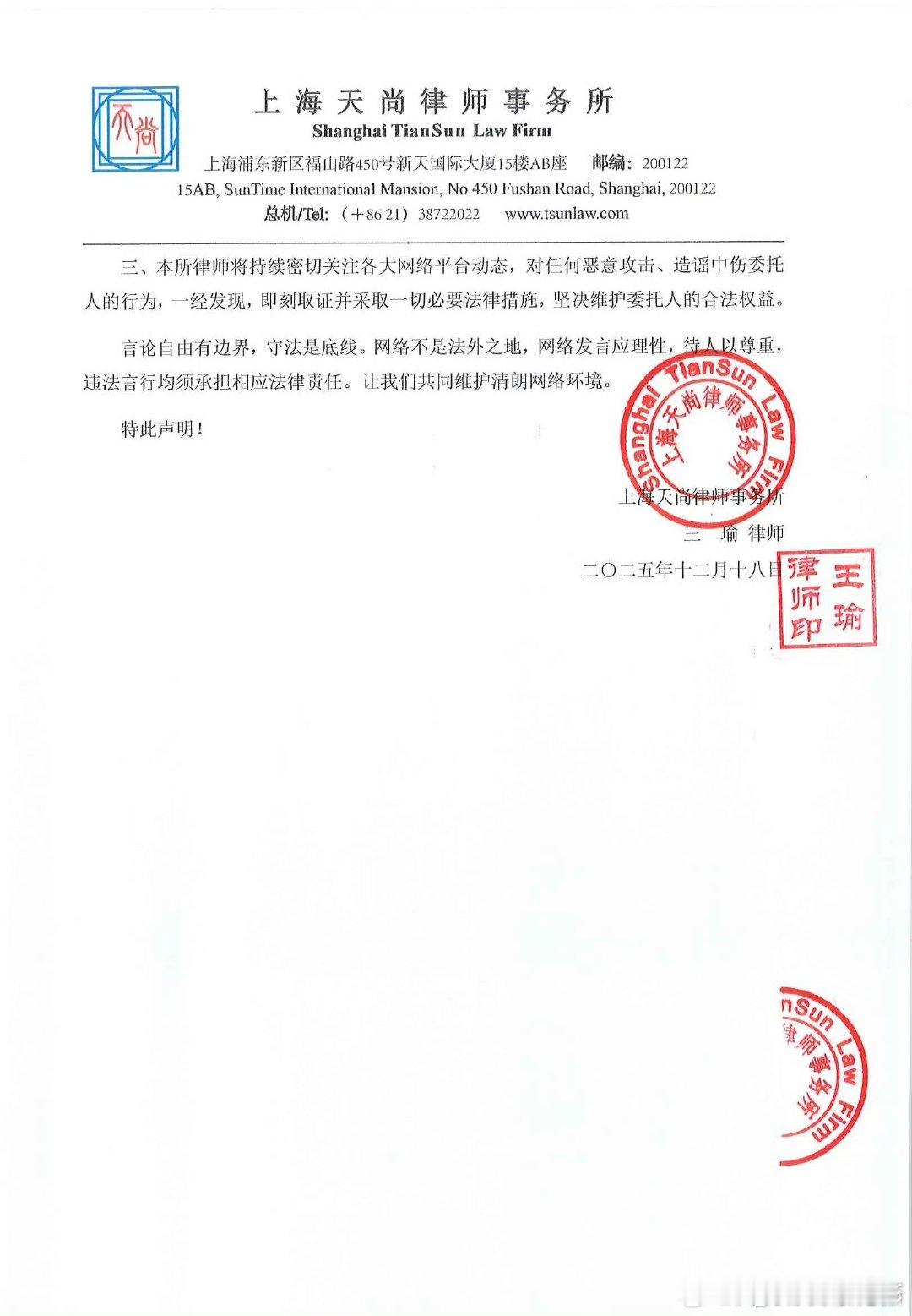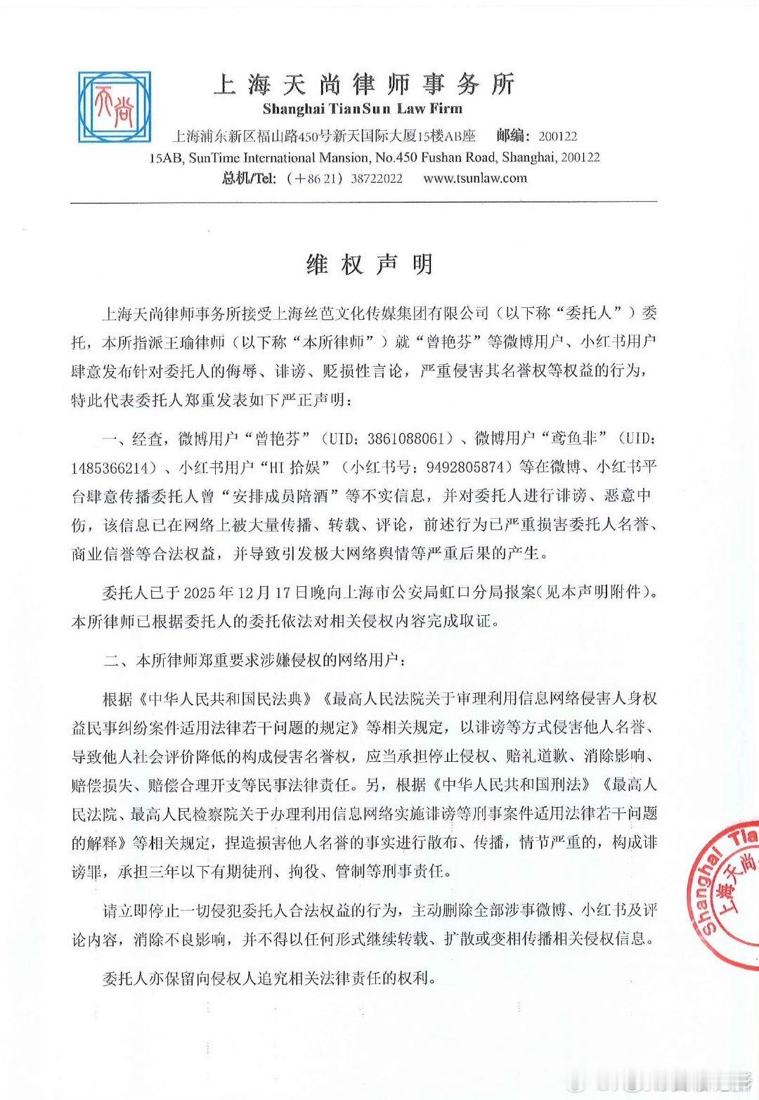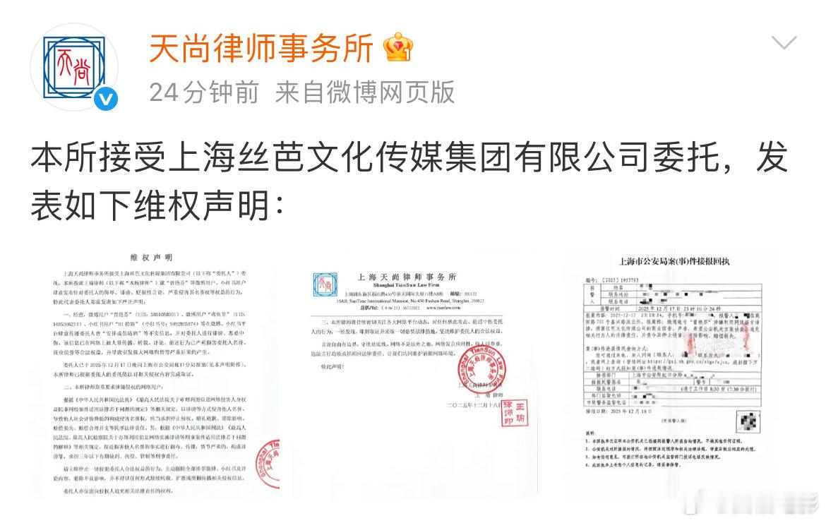 丝芭维权声明丝芭报案回执 丝芭报案回执,丝芭维权声明:经查,微博用户“曾艳芬”(UID:3861088061)、微博用户“鸾鱼非”(UID:1485366214)、小红书用户“HI 拾娱”(小红书号:9492805874) 等在微博、小红书平台肆意传播委托人曾“安排成员陪酒” 等不实信息,并对委托人进行诽谤、恶意中伤,该信息已在网络上被大量传播、转载、评论,前述行为已严重损害委托人名誉、商业信誉等合法权益,并导致引发极大网络舆情等严重后果的产生。委托人已于2025年12月17日晚向上海市公安局虹口分局报案(见本声明附件)。本所律师已根据委托人的委托依法对相关侵权内容完成取证。