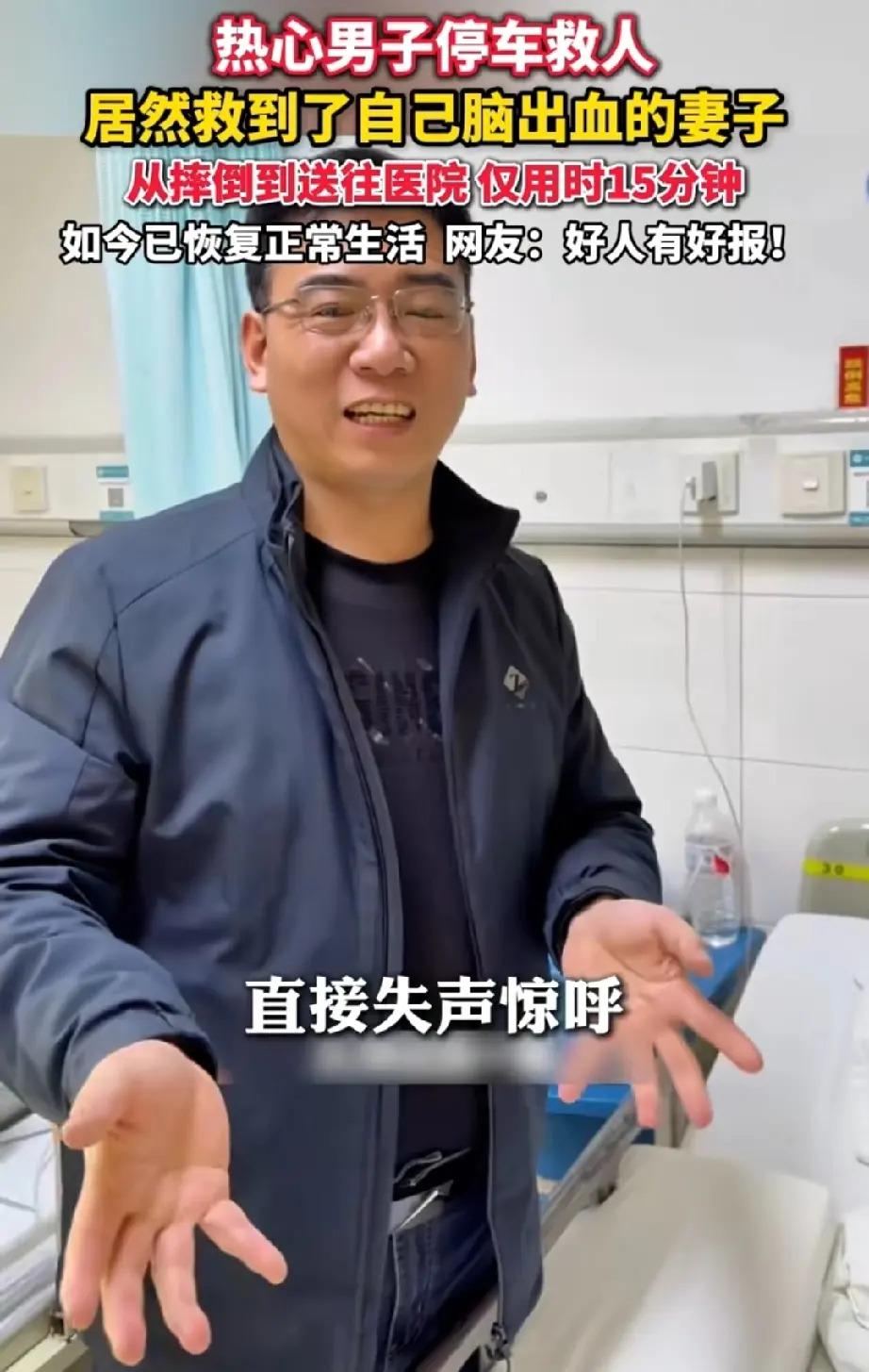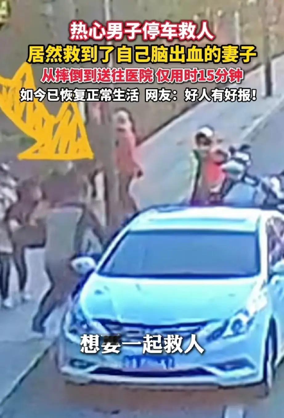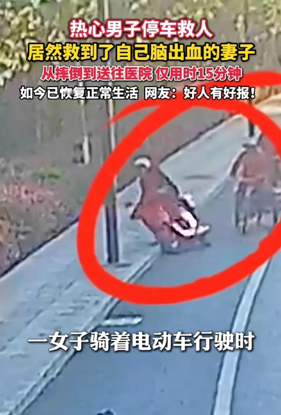 丈夫做梦也没想到,自己救人竟然救到自己妻子。 原来,在杭州街头,一女子正骑电动车在路上行驶,突然感到不适,电动车歪倒在路边。 下一秒,女子便倒在路上人事不省。 就在这关键时刻,一辆白色轿车经过。司机大哥见状,赶紧停车大喊:救人要紧,用我的车把她带到医院。 万万没想到的是,就在抬人的瞬间,男子发现这衣服、这面容怎么如此熟悉?再定睛一看,竟然是自己的老婆。 一刻也不敢耽误,在15钟的黄金抢救时间内,男子直接把妻子送上了手术台。 原来,妻子是突发脑溢血,经及时手术治疗后,已经康复,过上正常生活。 丈夫感谢老天爷在妻子最需要他的关键时刻,他能及时出现救她于危难之间;妻子感谢丈夫如天神般护佑她周全,让她捡了一条命回来。 其实,所有的果都是因带来的。丈夫做好事成习惯,这是老天特意给他的机遇,他伸手牢牢抓住,递给了妻子一根救命稻草。 好人有好报,爱他人就是爱自己,所有释放过善意与爱意,会在不经意间给你大大的回报! 记住做个好人吧!