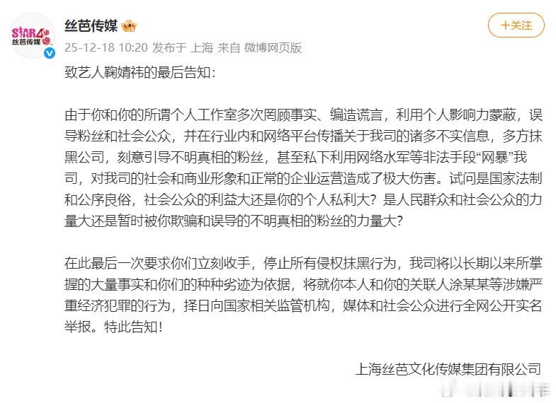 丝芭说鞠婧祎引导粉丝丝芭传媒:鞠婧祎涉嫌严重经济犯罪,将择日向国家相关监管机构实名举报