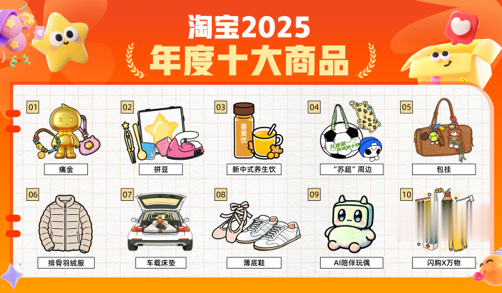 今天,淘宝揭晓2025年度十大商品,痛金、拼豆、包挂、新中式养生饮、薄底鞋、车载床垫、排骨羽绒服、AI陪伴玩偶、“苏超”周边、闪购x万物脱颖而出。