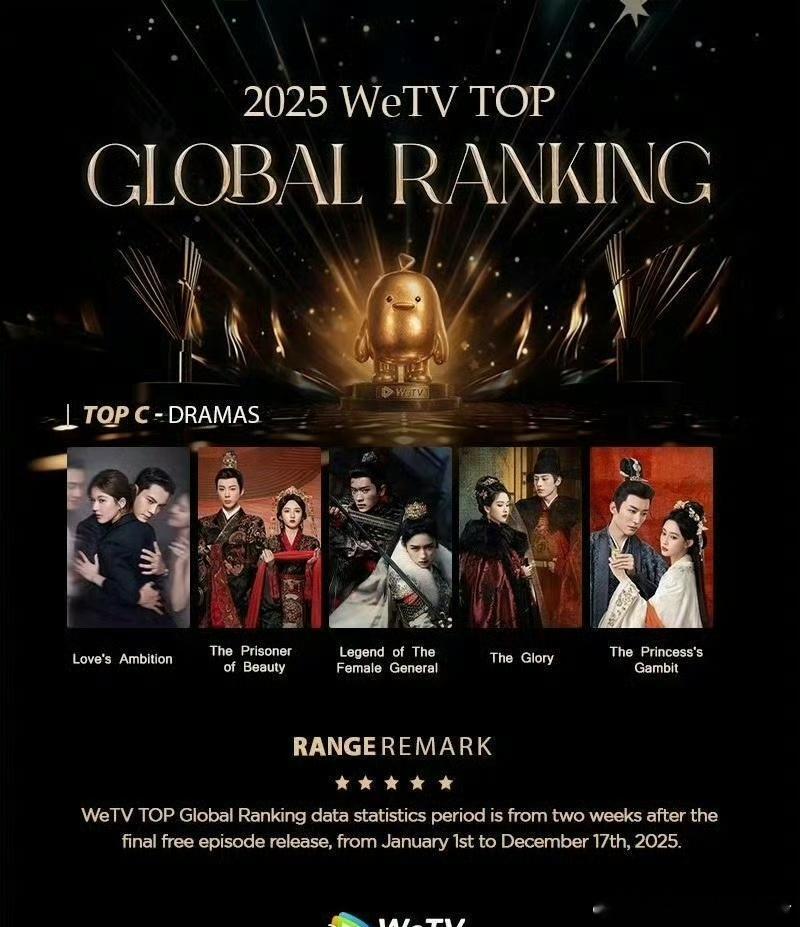 2025腾讯WeTV全球国产剧前五,你觉得哪部剧更出圈?赵露思 陈伟霆《许我耀眼》 宋祖儿 刘宇宁《折腰》周也 丞磊《锦月如歌》 陈都灵 辛云来《雁回时》刘学义 孟子义 《桃花映江山》