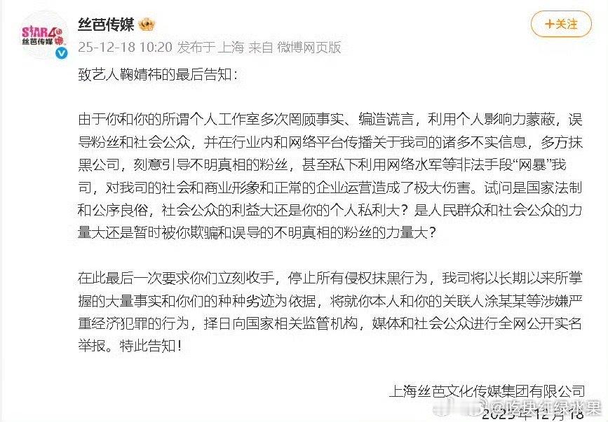 我去 丝芭传媒致鞠婧祎的最后告知来了 看上去真的好严重 不知道鞠婧祎会如何回复鞠婧祎 王一栩 丝芭曾起诉鞠婧祎代言品牌 鞠婧祎 丝芭