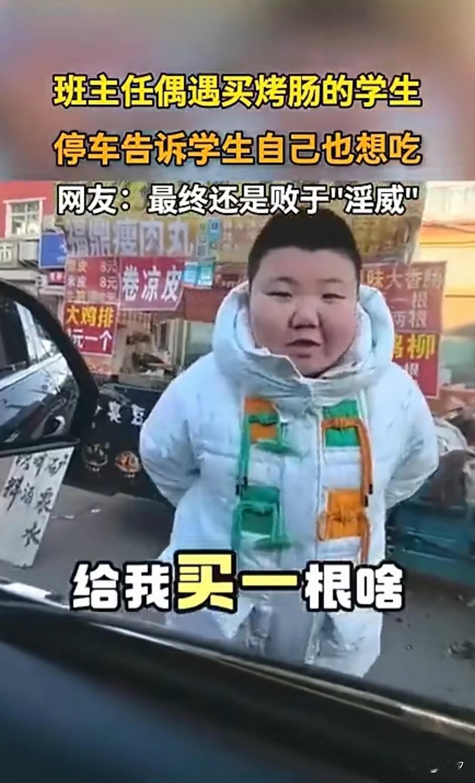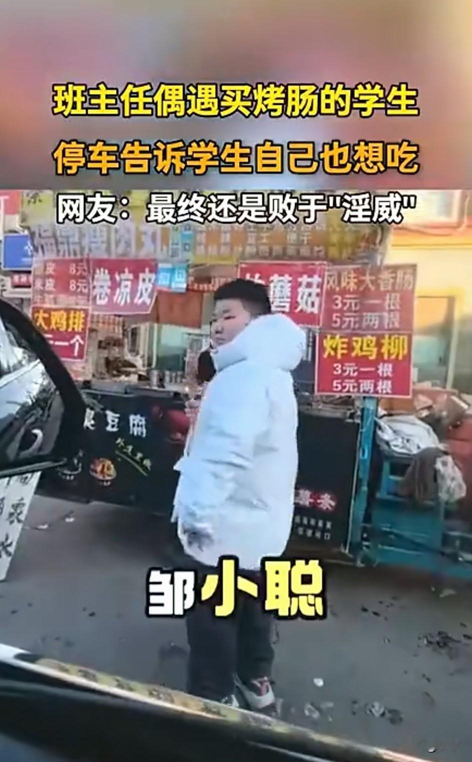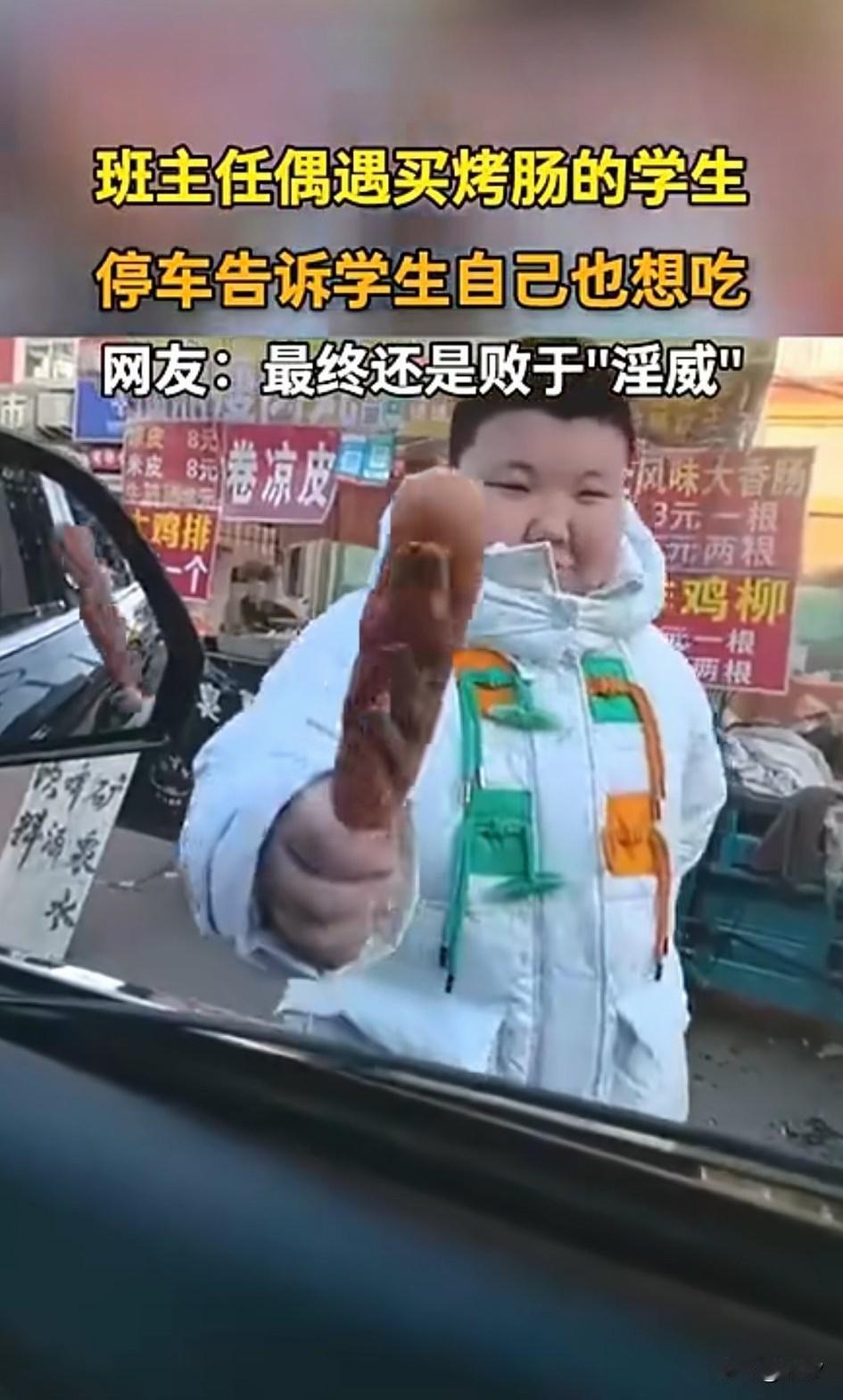 小学生都很怕老师, 一名叫做邹小聪的小学生, 穿着厚厚的棉袄, 在一堆卖小吃的摊前晃悠, 可能想了很久, 才决定买了一根烤肠, 刚拿到手还没有吃, 突然一辆轿车停在了他的旁边, 女司机摇下了车窗, 喊出了他的名字, 这可把他吓了一跳, 回头看到是自己的老师, 下意识的将烤肠护不在身后, 还以为老师要批评他, 结果女老师一开口就把小胖惊呆了, 女老师笑嘻嘻的说给我买一根, 小胖以为自己听错了, 犹豫了2秒之后, 小胖默默将身后的烤肠递给了老师, 既然保护不了烤肠, 那还是献出去吧! 大家对于女老师让小学生给她买烤肠怎么看? 老师的品德和才华,哪个更重要 好老师很重要,大家认同这个观点吗 自制纯手工烤肠 小学生困惑分享