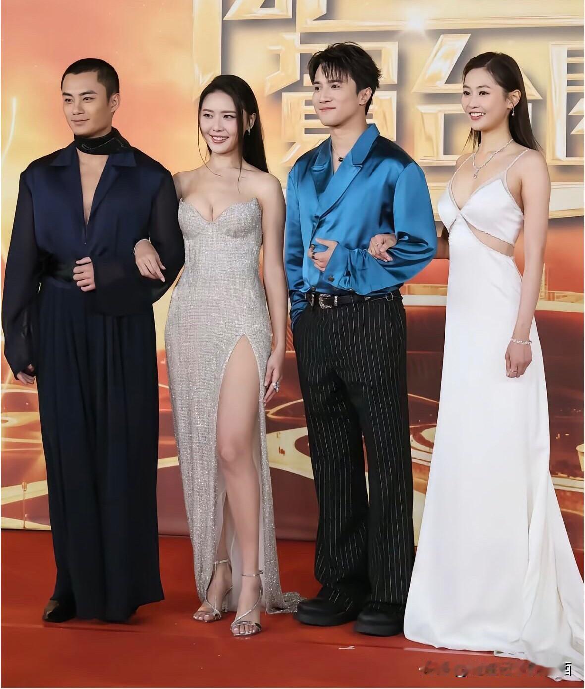 四位明星的同框合影,两个美女们一个比一个有气质,风格虽不同,但我更喜欢中间的这一位,个子是小巧玲珑的,不过她的身材很完美,凹凸有致的,看起来是肤白貌美的大长腿美女。 右边的美女个子高挑,不过气质一般般,还有左边的男明星,这是穿的舞蹈服吗?