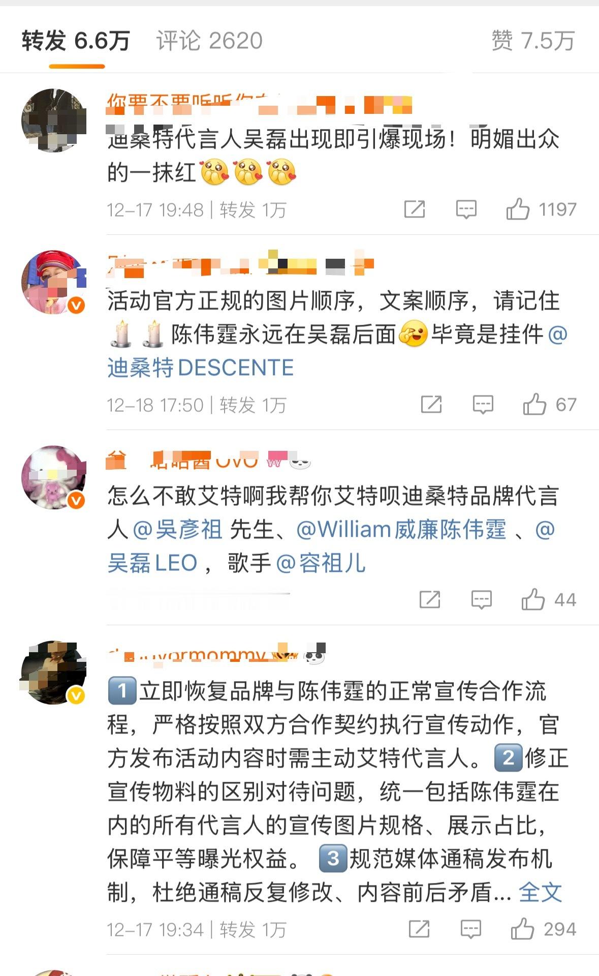 迪桑特的图片顺序是 吴彦祖 吴磊 陈伟霆没有艾特名字这个态度很明确了 图肯定不是随便放的