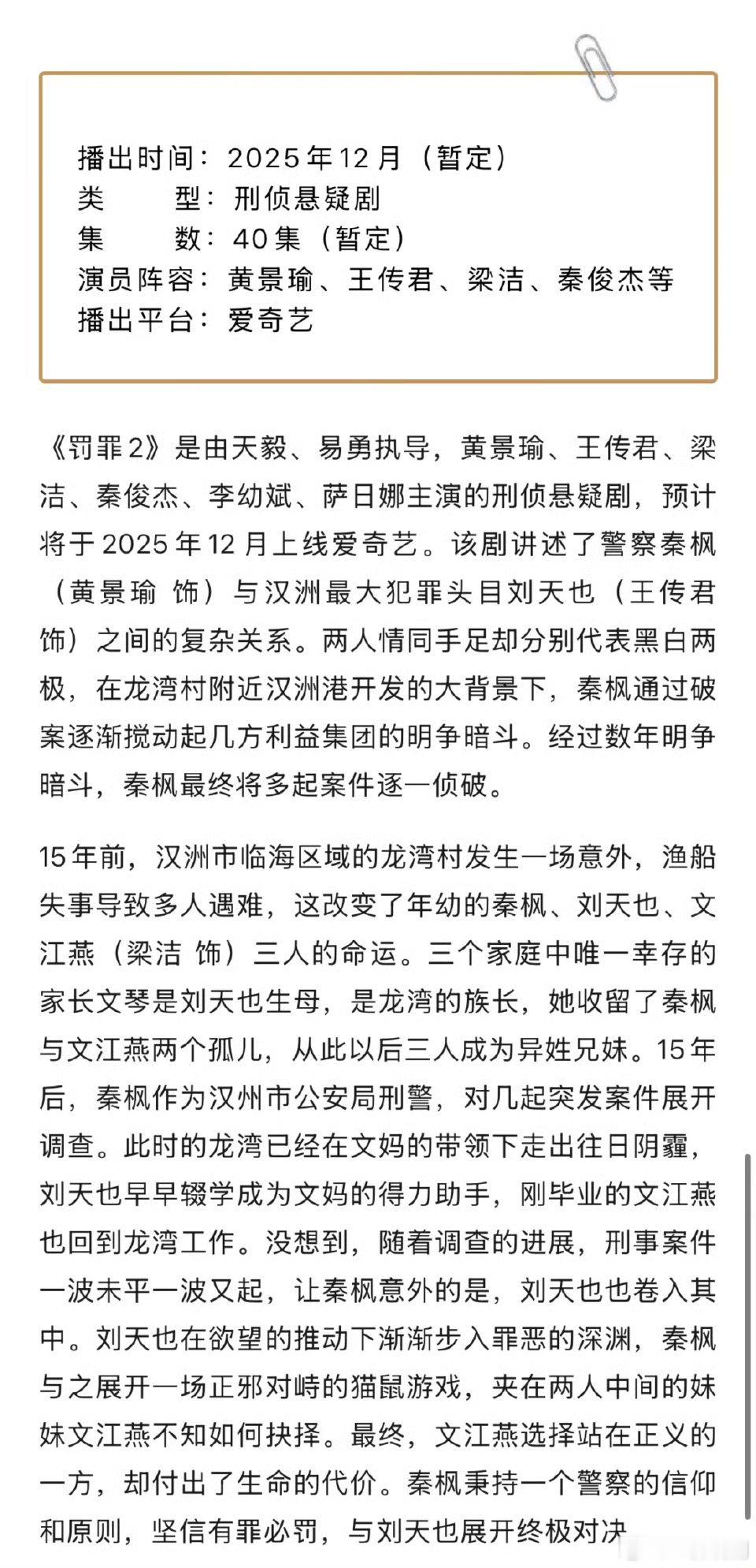 由黄景瑜、王传君、梁洁主演的网剧罚罪2启动播前招商,预排12月上线爱奇艺独家首
