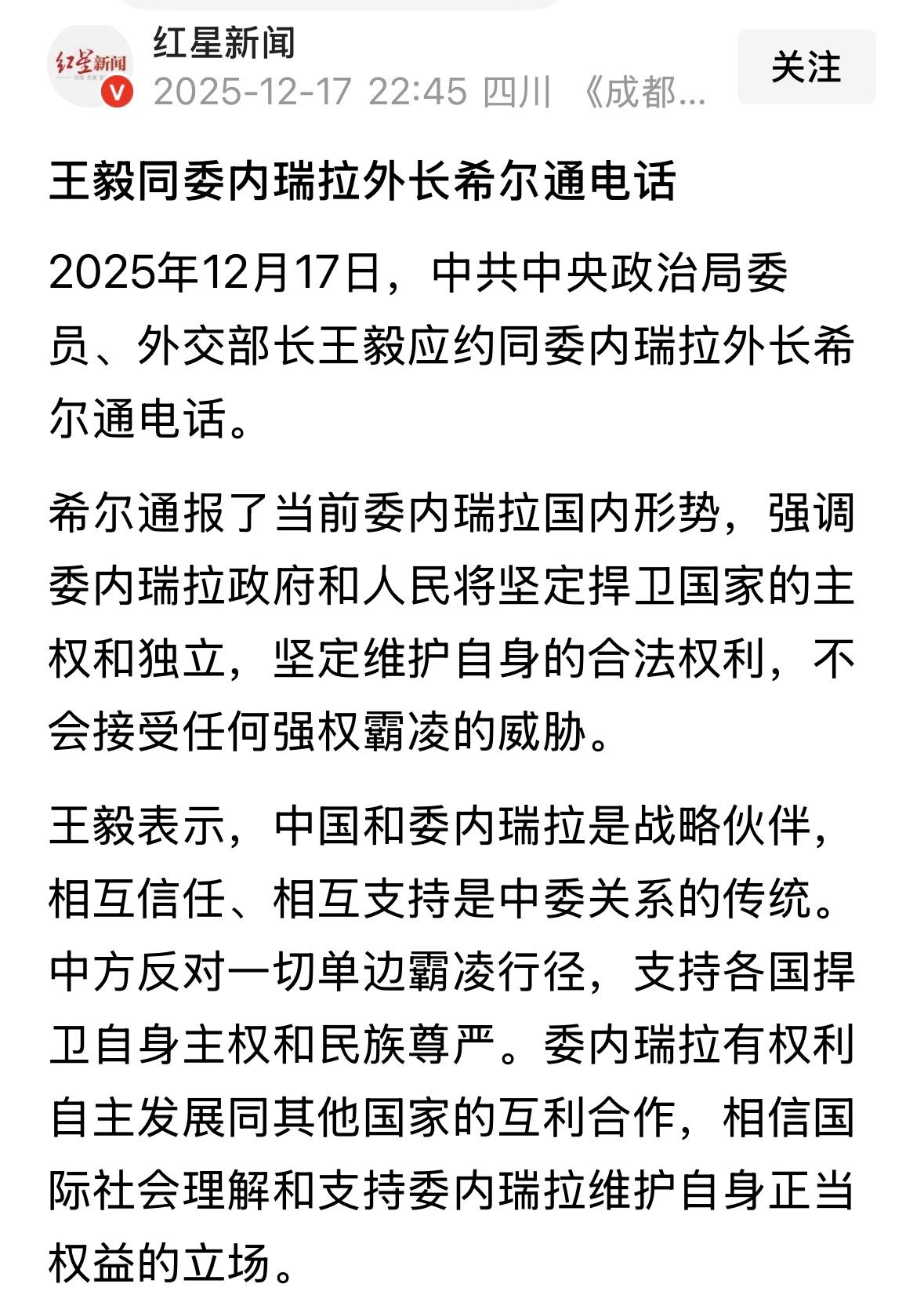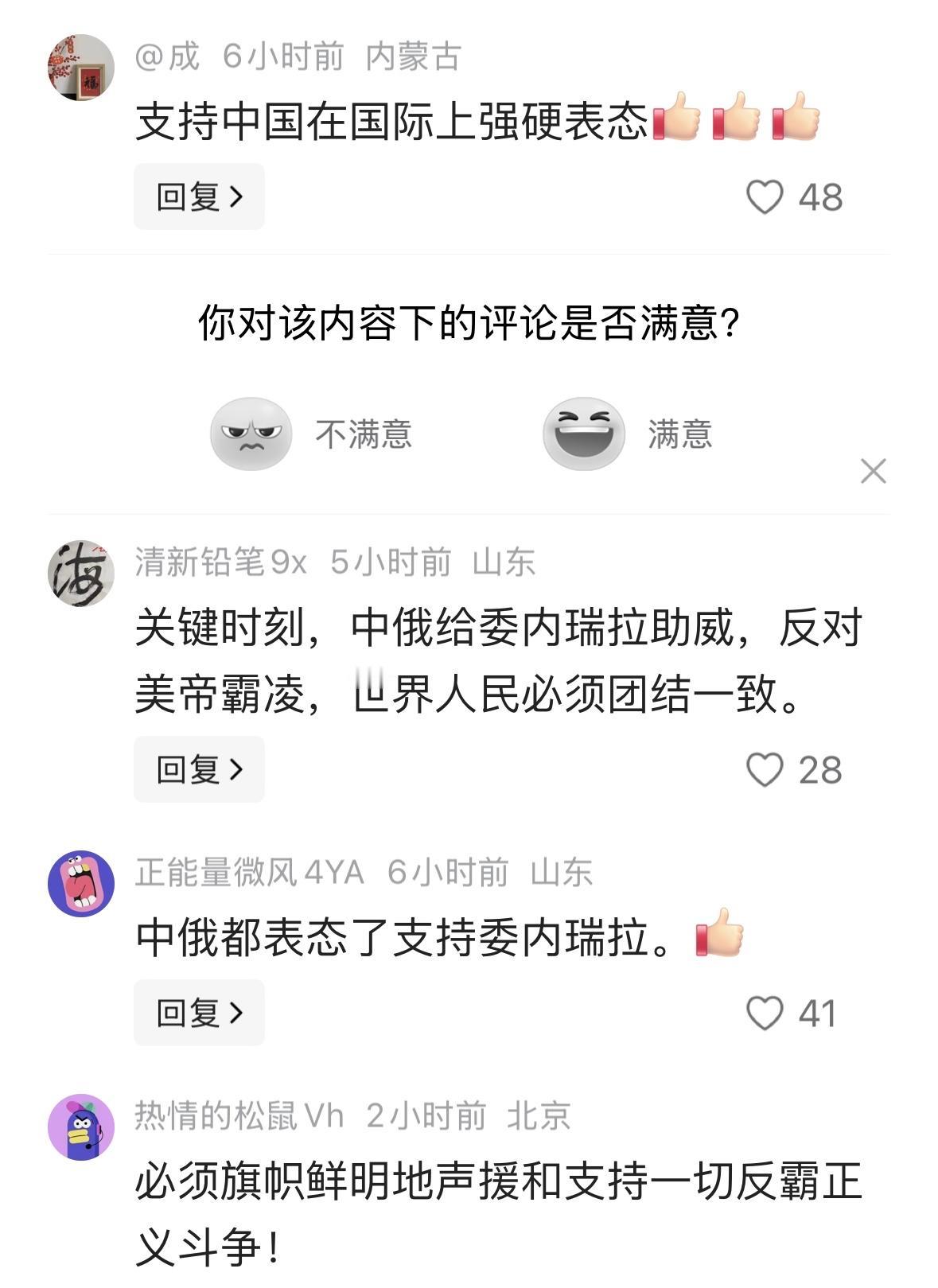 就委内瑞拉局势,中国强硬表态,坚决与委内瑞拉人民站在一起,坚决支持马杜罗总统维护国家主权,与美国霸权主义做坚决斗争……