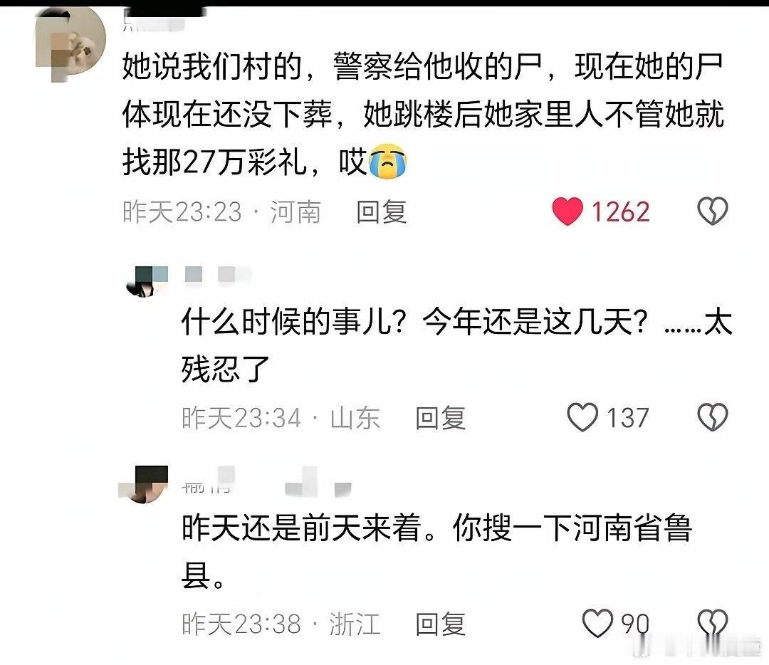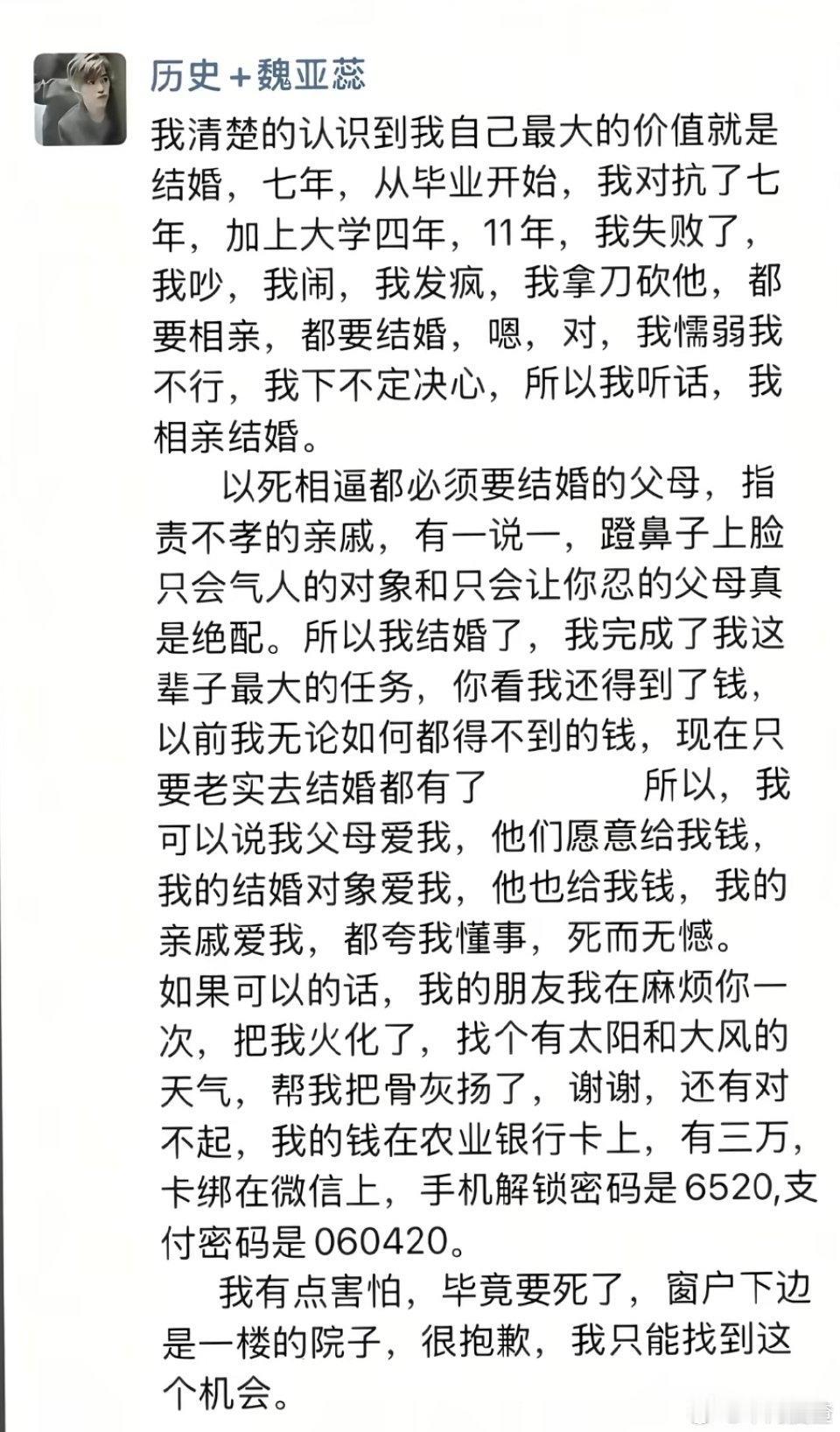 坠亡女教师父母不愿退还彩礼,而且拒绝退婚。他们认为女儿已经完婚,已经成为男方的家人,后续事情应该男方处理。 而男方也冤啊,人都没了,这算什么完婚,那可是27万的彩礼,这就白白打水漂了! 摊上这样的父母,我们也就能理解魏亚蕊绝望的心情了。 第一,家里还有一个未婚的弟弟,魏亚蕊从大学毕业,父母亲戚就催婚逼婚,甚至用不孝来进行道德批判,根本没有人尊重魏亚蕊的想法。据了解,婚礼前一天,魏亚蕊已经提出取消婚礼,然而在父母的极力反对下,还是如期举办了。悲剧发生后,竟然没有人愿意处理其遗体,结合其父母如今的态度,足以让魏亚蕊寒心。 第二,这个丈夫也不咋地,魏亚蕊在朋友圈提及,对象蹬鼻子上脸只会气人,说明两人的感情也不牢靠,但凡男方靠谱一点,体贴一点,女方也许都会将就一番,至少不会走极端。 第三,魏亚蕊也许真的解不开这个结,一方面男方不体贴,靠不住。另一方面父母又一个劲把自己往外推,没有一个人真正为她着想,她该何去何从。有人说她可以去外地。她刚刚考上教师编制,对于农村孩子来说,有份稳定工作不容易,反复纠结之下,走上了绝路。 在交代后事时,也是委托朋友火化遗体,可见对父母有多绝望!