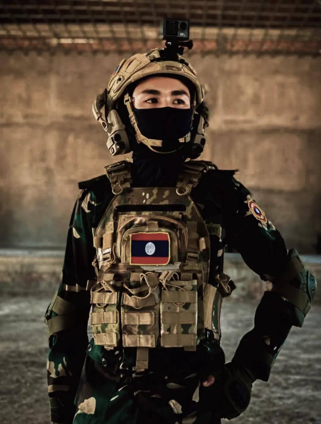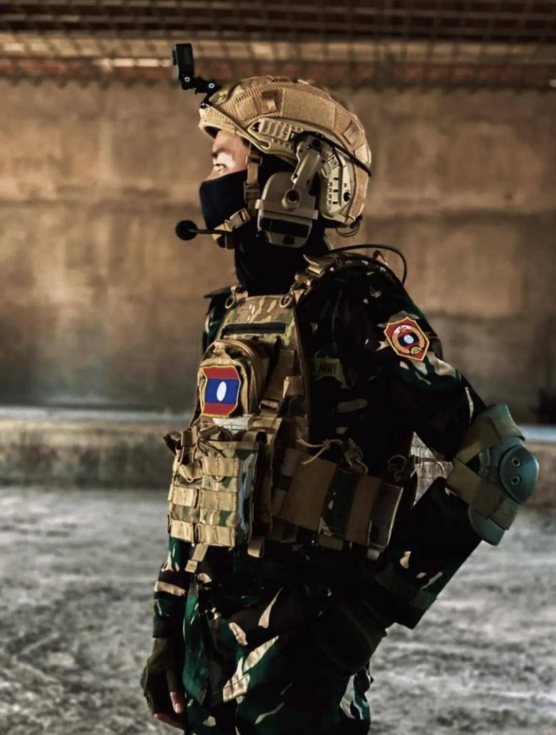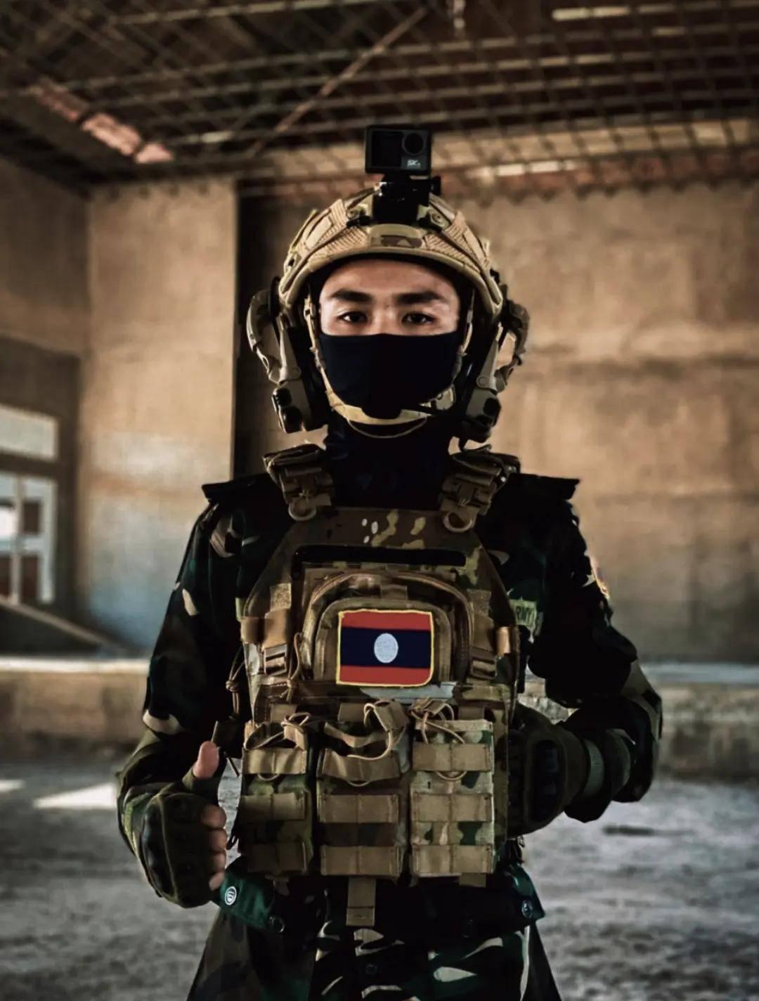 老挝人民军步兵测试一套现代化装备,包括棕褐色MOLLE战术背心、配备摄像头支架的Ops-Core式头盔、护膝/护肘以及巴拉克拉法帽,这些装备搭配虎纹制服,可能标志着礼仪和作战行动中战术装备的标准化。 图片记录了万象街头夜间彩排的场景,街道上悬挂着国旗,这与2025年12月2日老挝第50个国庆阅兵式后的庆祝活动训练相呼应。那次阅兵式有超过20个方阵以及盟军参与。