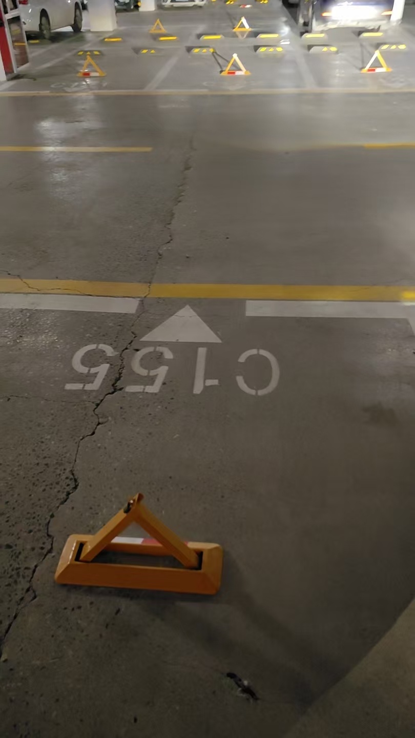 我们小区的地产为了让我们买车位都装上了地锁买车位可以,你看这裂了缝的水泥地面、不够宽的距离以及12万一个车位的售价,合适吗?
