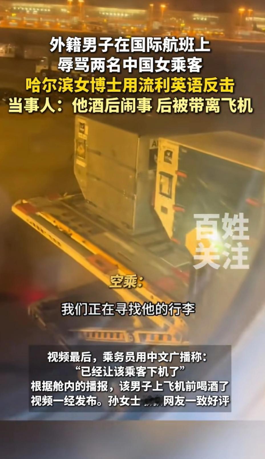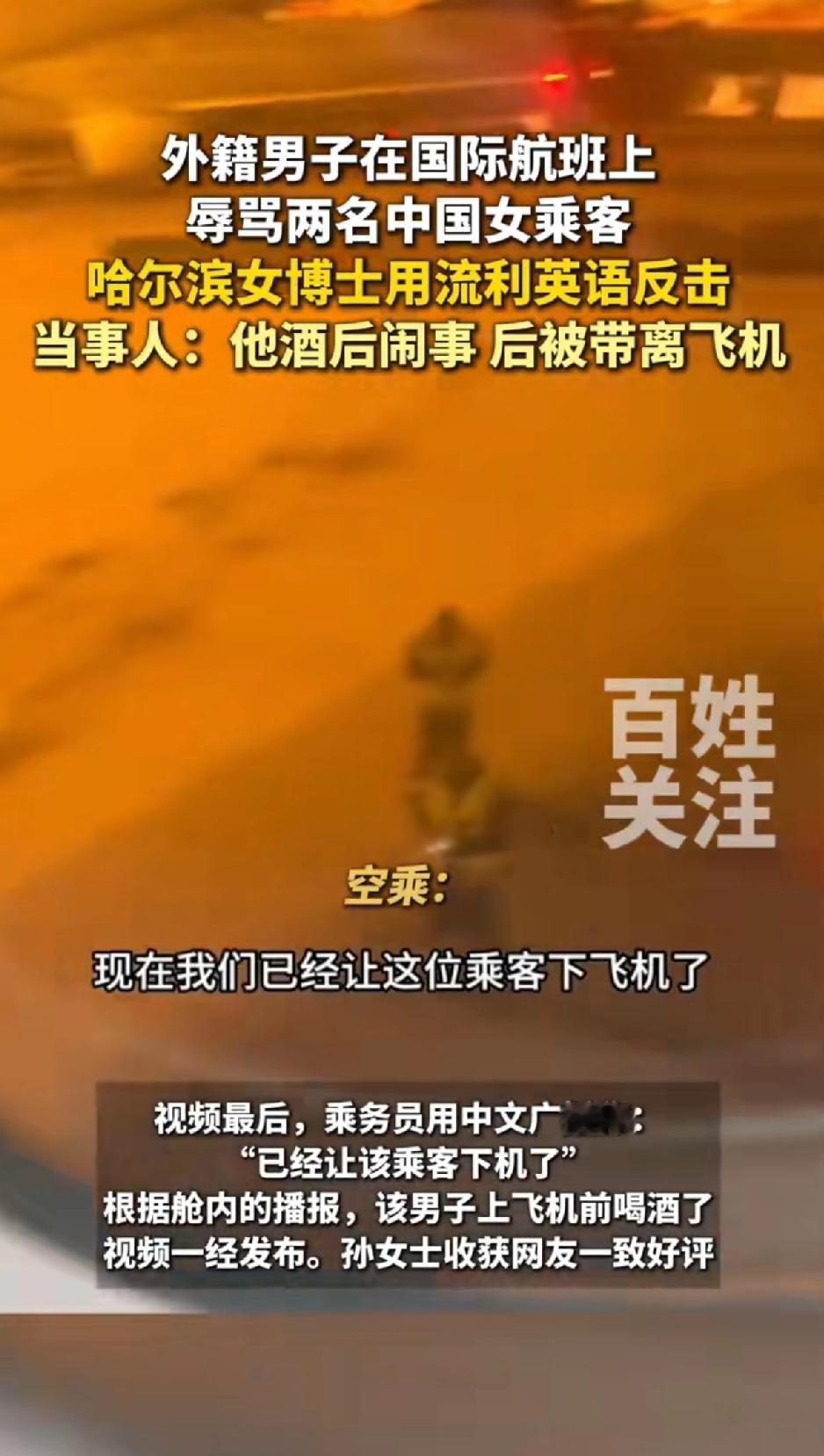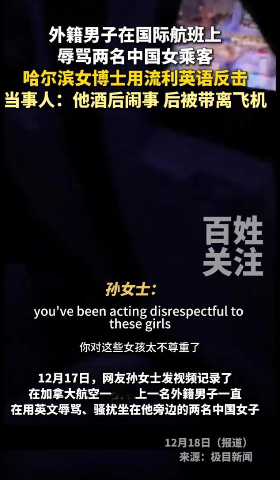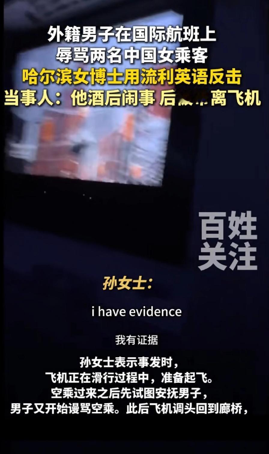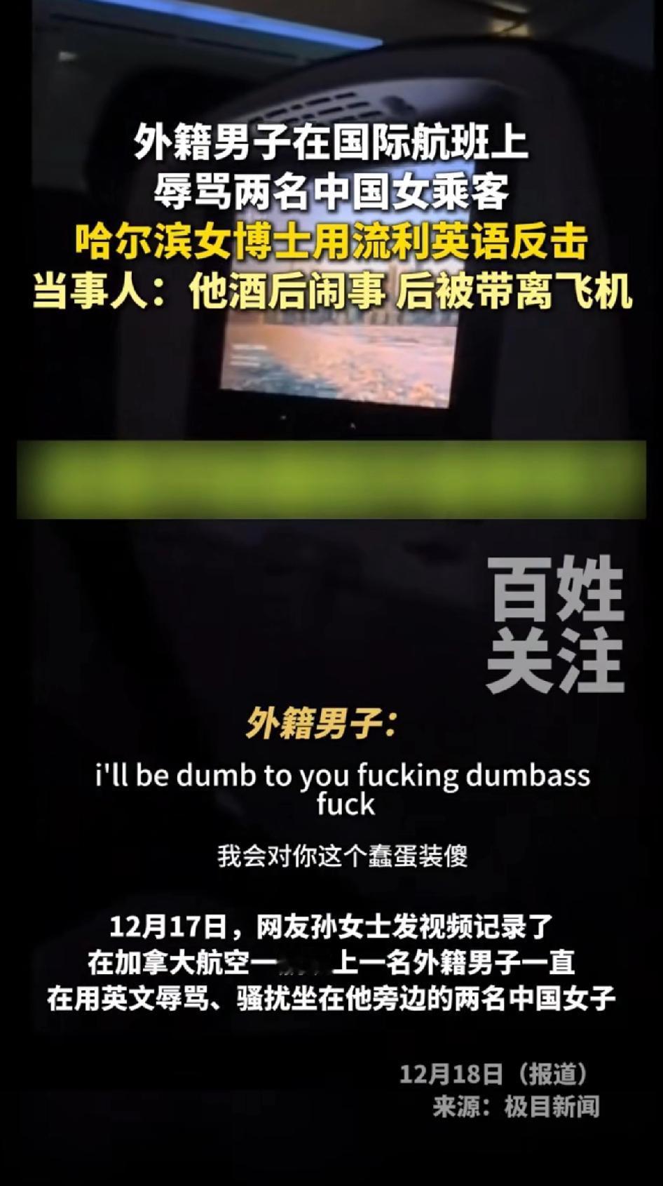 外籍男在国际航班上辱骂两名中国女乘客,哈尔滨女博士用流利英语反击。 这件事发生于12月15日加拿大航空AC62航班。当时,坐在前排的外籍男子喝了酒,对旁边两名中国女子恶语相向,称她们“蠢蛋”“哑巴”,还动手推搡座椅。 女博士孙同学直接霸气开怼,一句“Sir, this is not your living room! Apologize to them—NOW!”镇住对方。 男子恼羞成怒,她又用“Your racist behavior is recorded and will be reported to Transport Canada”让其无言以对。 最后男子被带离,全舱鼓掌,有人喊“Well done, China!”孙同学是多伦多大学免疫学在读博士,这反击太提气。 论骂人中国人还能输了,尤其是中国女人,建议这位女博士再用中文骂一遍那个无理加拿大男人,祖宗十八代都问候一遍,不把他骂的找不到北,都不能算完事。让他知道你在骂他,非把他搞崩溃不可。 让他长长记性,再也不敢随意辱骂别人。