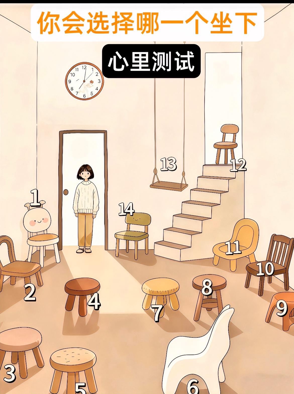外网当下超火的一道, 心理小测试来啦 要是你走进这个房间, 面对这14把椅子, 你会挑哪一把坐下呢? 心里 心里测试