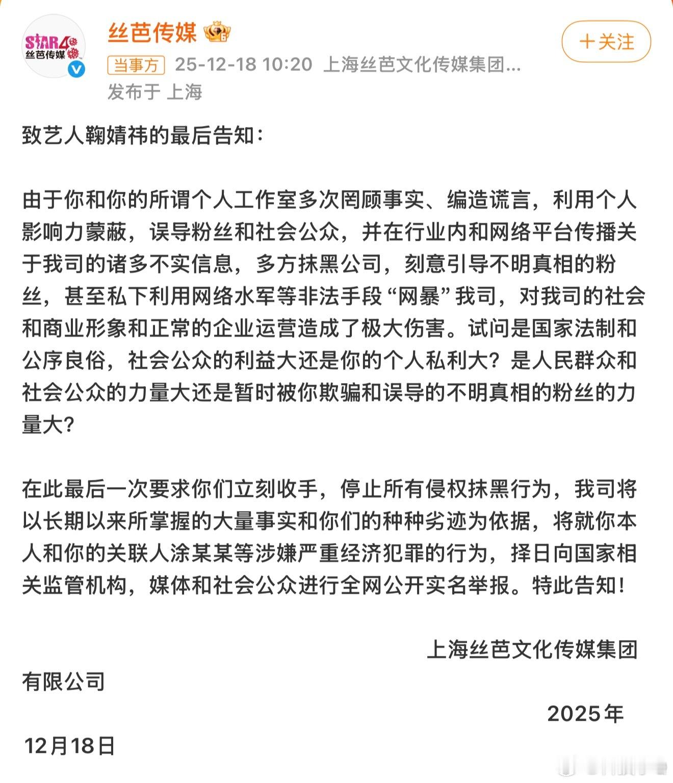 丝芭指控鞠婧祎严重经济犯罪看着公告和评论,又是一场大仗哦!