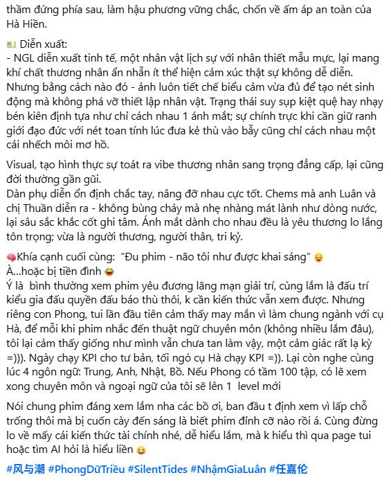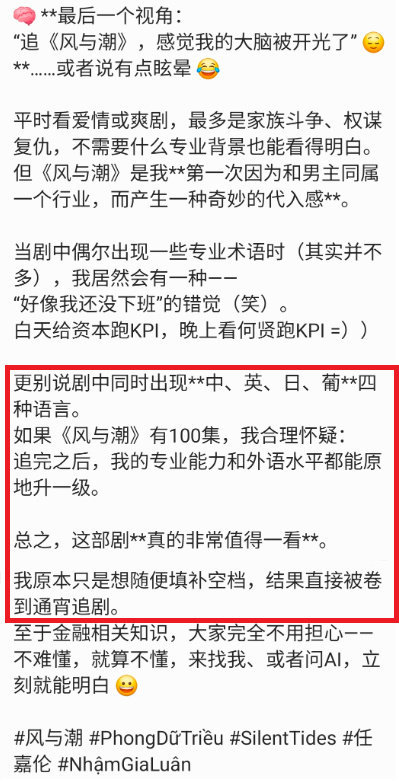 任嘉伦风与潮海内外好评如潮,一位 8.1 万粉的越南博主,身为金融从业者从剧里感受出了职业的价值!她为《风与潮》写下长评,夸赞剧情和演员!!