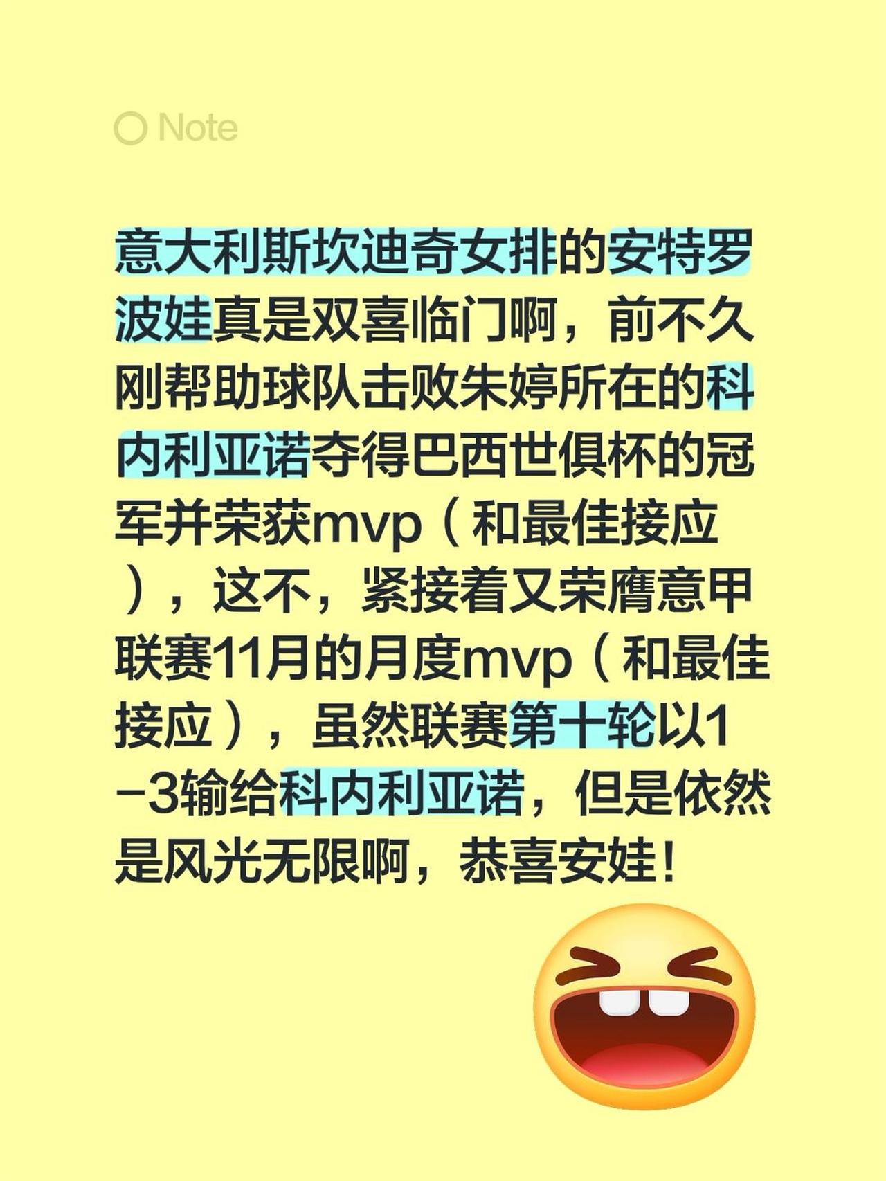意大利斯坎迪奇女排的安特罗波娃真是双喜临门啊,前不久刚帮助球队击败朱婷所在的科内利亚诺夺得巴西世俱杯的冠军并荣获mvp(和最佳接应),这不,紧接着又荣膺意甲联赛11月的月度mvp(和最佳接应),虽然联赛第十轮以1-3输给科内利亚诺,但是依然是风光无限啊,恭喜安娃!