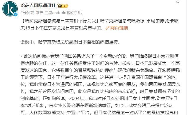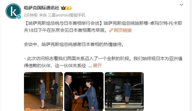 12月18日,哈萨克斯坦总统和日本首相会晤! 在今天,也就是12月18日,哈萨克斯坦总统在日本访问,他除了和德仁天皇会晤之后,又和日本首相会晤了,从曝光的画面我们可以看出,当天日本首相看起来还非常开心,穿一件淡蓝色的西装搭配淡蓝色短裙出镜,还亲自在首相府邸门口迎接哈萨克斯坦总统,更加让小伙伴们意外的是,日本首相还给予哈萨克斯坦高规格的欢迎仪式,在迎接现场,不仅有红毯,还有仪仗队,仪仗队还举着两国的国旗。哈萨克斯坦总统和日本首相同框握手的时候,日本首相露出满脸的笑容。 据哈萨克斯坦总统表示,这是他当总统以来首次访问日本,我们常称日本为遥远的邻国,却视其为亲密可靠的朋友。可以说在哈萨克斯坦的发言中,说的都是好听话。根据媒体报道,两国在很多领域进行了交流和合作。