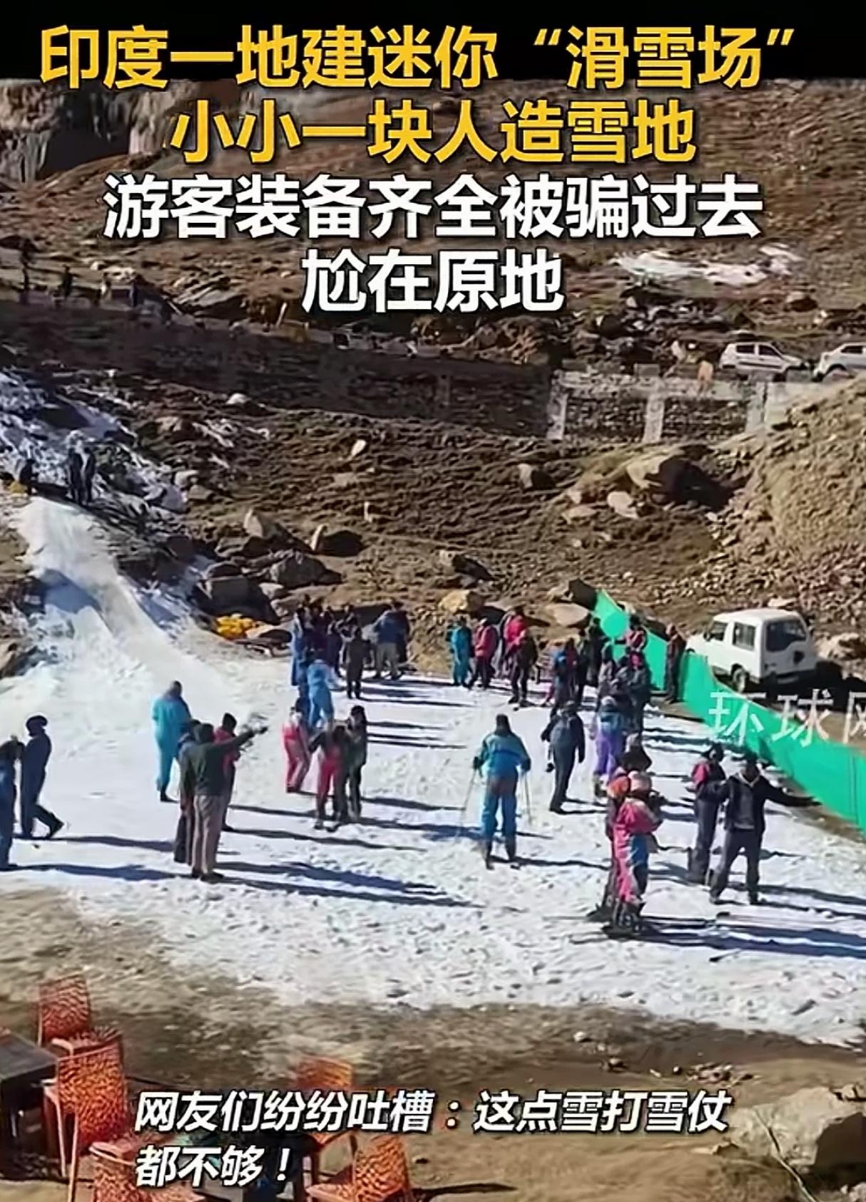 印度旅游机构打造了一片小型人造雪地,并大肆宣传滑雪活动,当游客穿着装备满心欢喜的来滑雪的时候,直接懵了!这点雪说实话打雪仗感觉都嫌少,就这还滑雪,印度人吹什么不好,非要拿这个做文章,不过从这也能看得出,印度也是渴望滑雪场呀,但问题是地缘并不友好啊!